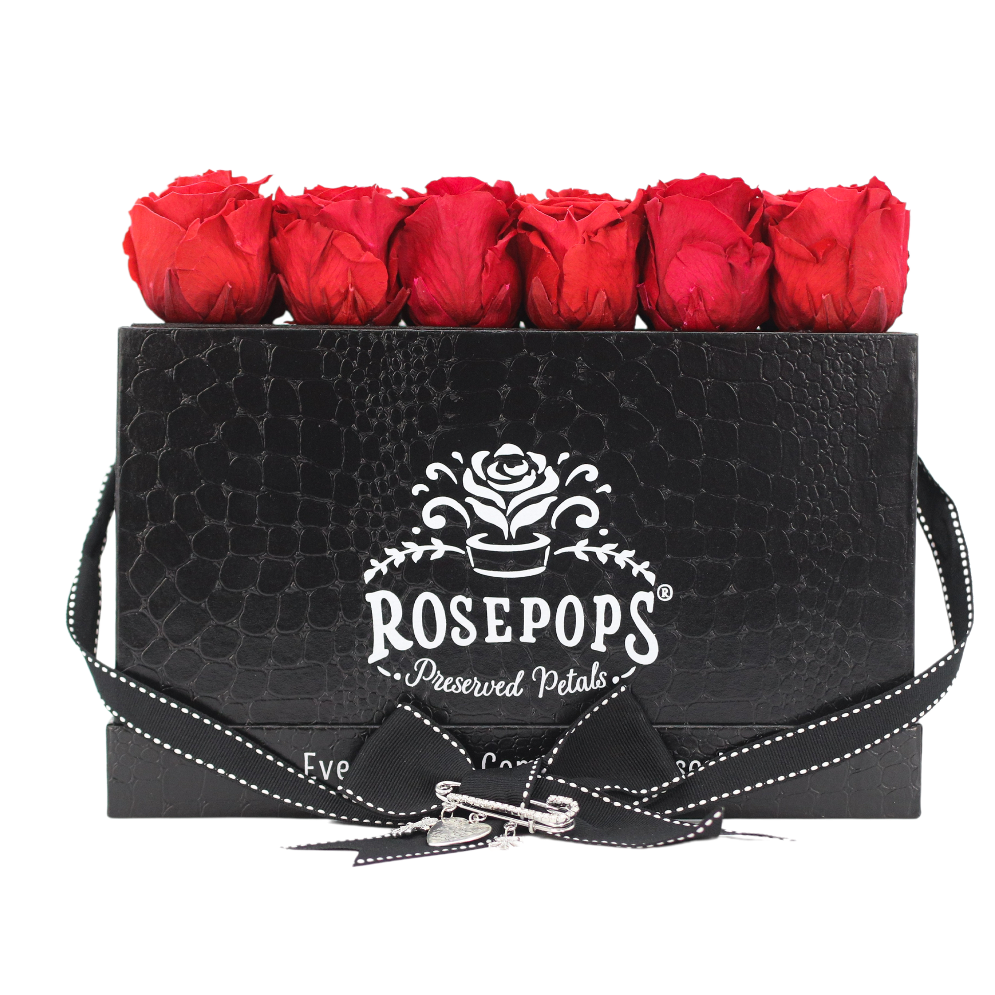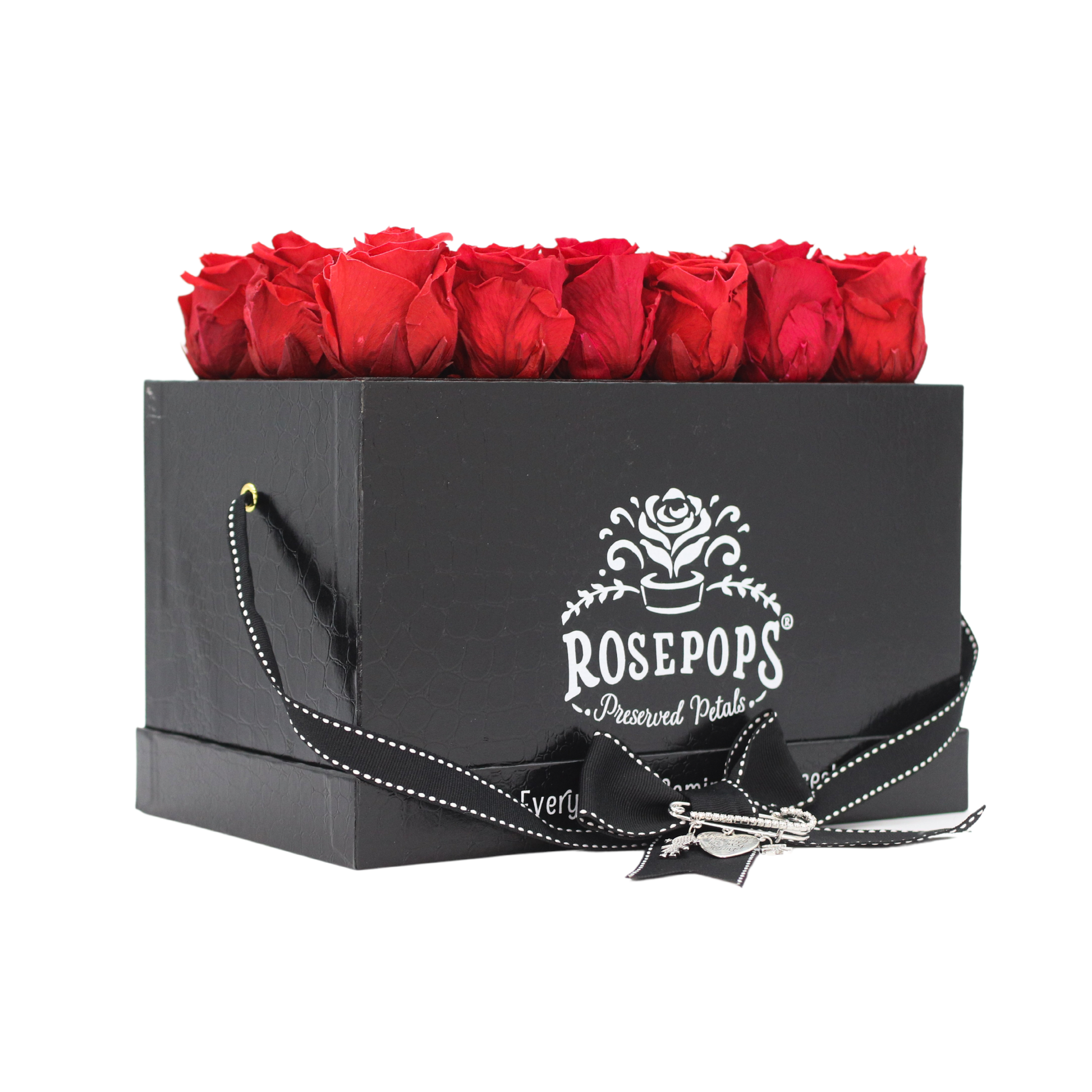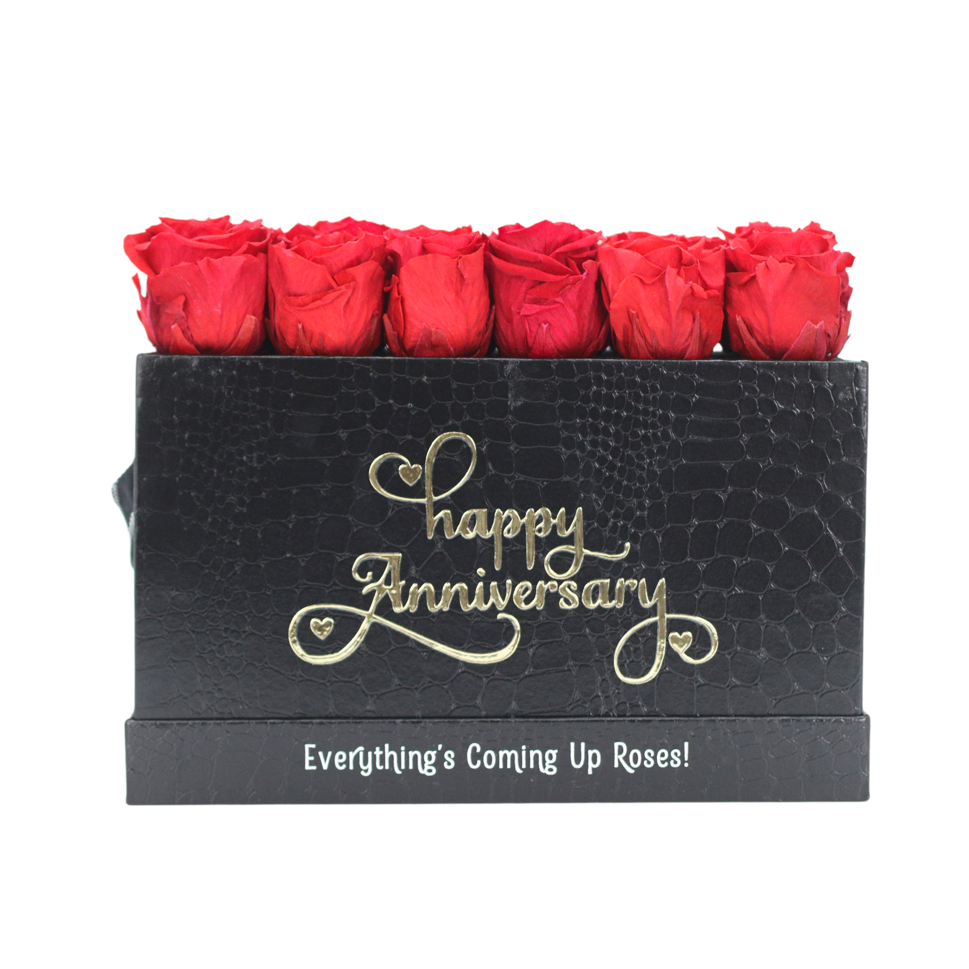 Eighteen ravishing Cherry Blooms housed in Black mock crocodile are sure to delight with their gleaming "Happy Anniversary" appliqué! A trio of charms is a wonderful finishing touch to this dozen roses that will last way beyond!
