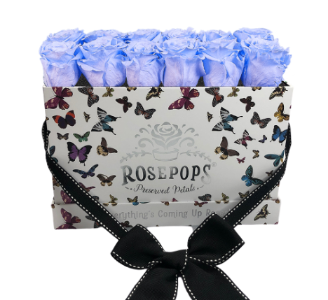 One Dozen ravishing Blue Bon Bon blooms artfully arranged in a soft Butterfly box are the perfect pairing for any lucky loved one! These preserved petals are sure to show your special someone just how much they are appreciated!