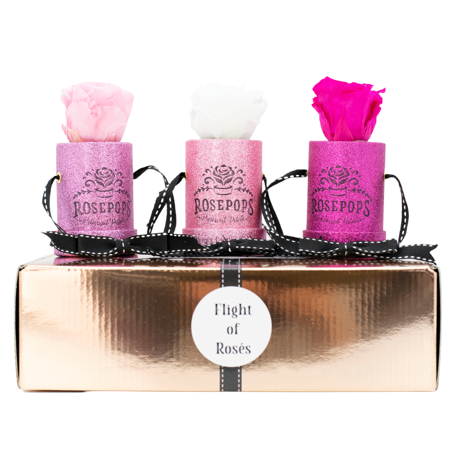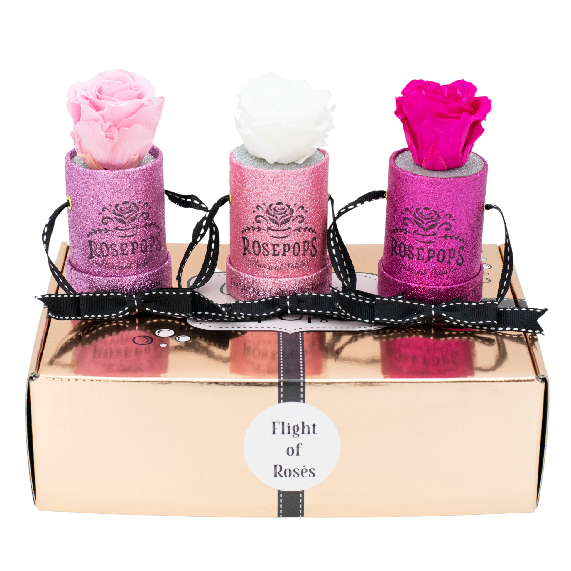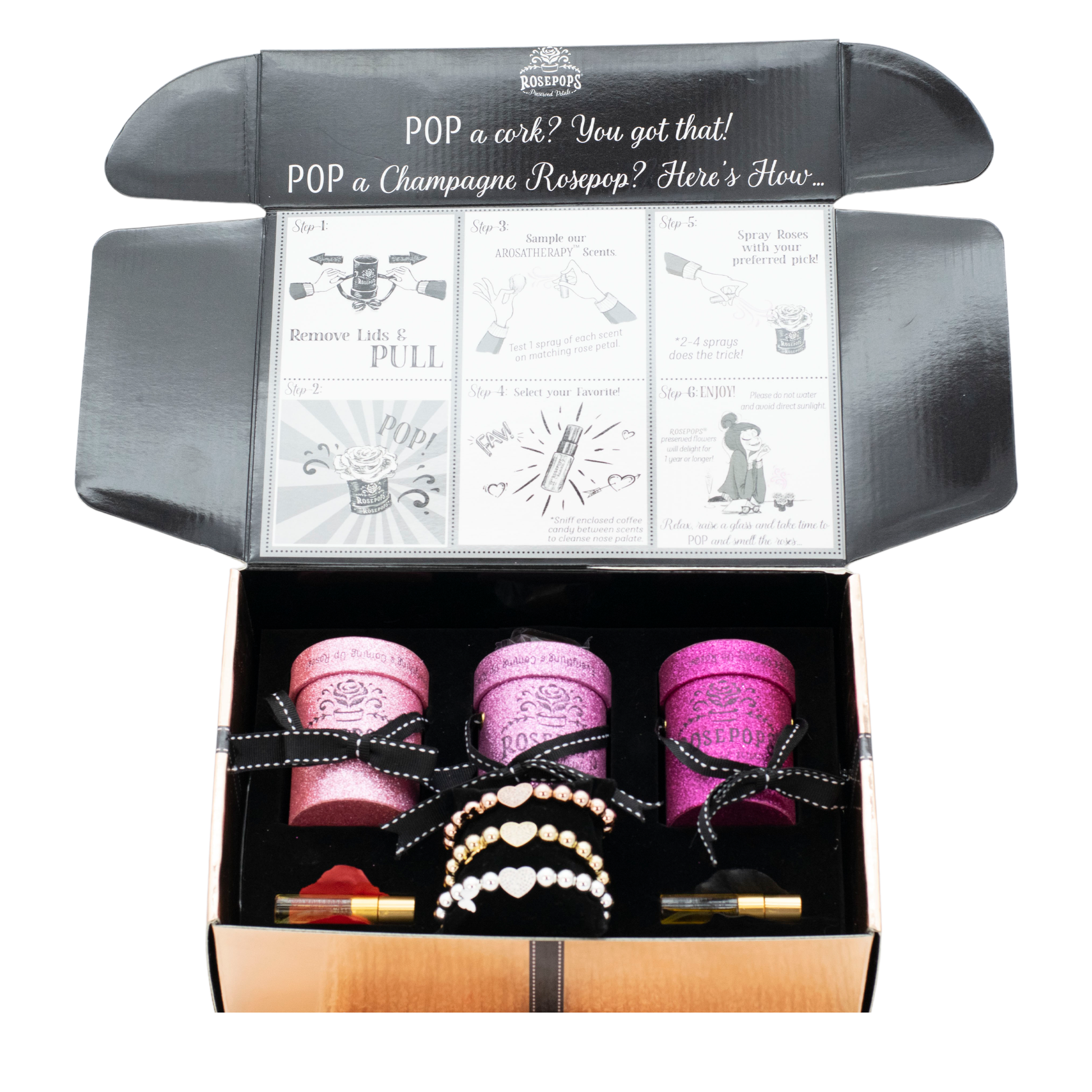 What’s even better than a regular set of Champagne POPs? A set that includes 3 tricolor gold bracelets designed exclusively for Rosepops by renowned jeweler, Rachie Shnay! Any recipient of this premium set will delight in selecting between the enclosed Red Carpet Rose and Black Tie Bouquet fragrance samples to scent their beautiful Cherry blooms. And the “POP Rocks” bracelets bring just the right amount of bling to take this gift to the next level!