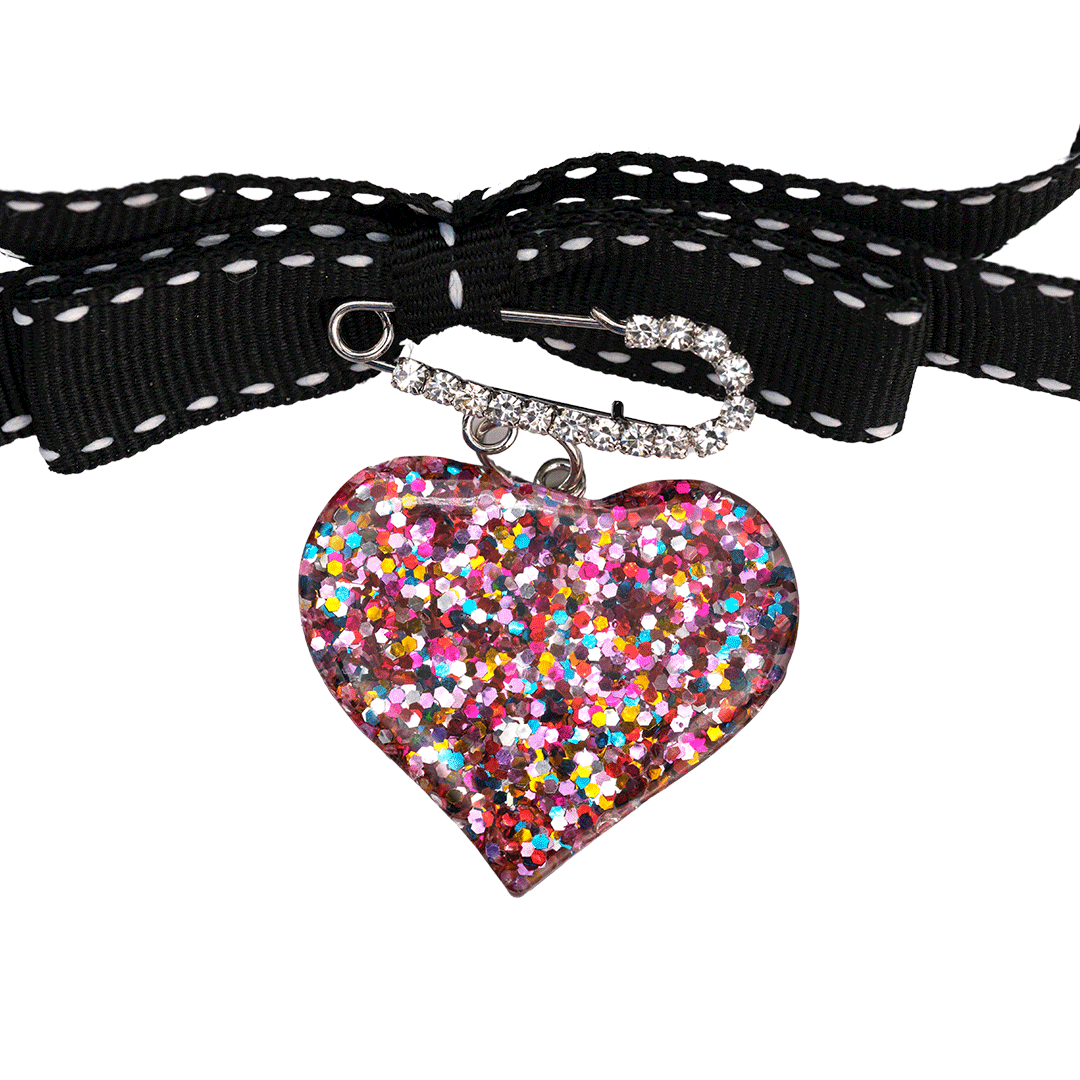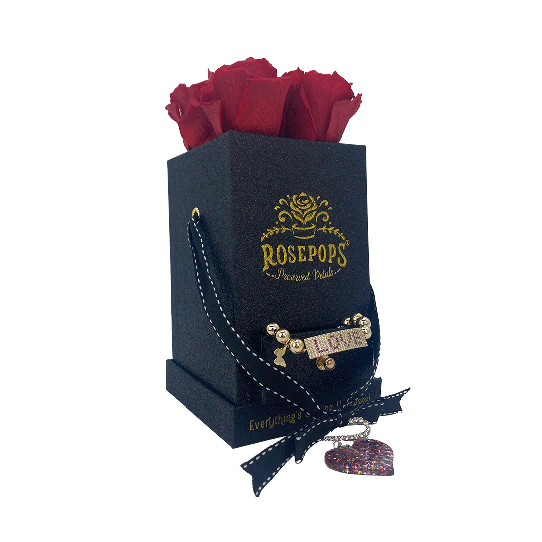 This black glitter unforgettable Fourget Me Not box boasts 4 gorgeous red roses, a custom multicolored heart box charm and so much more!