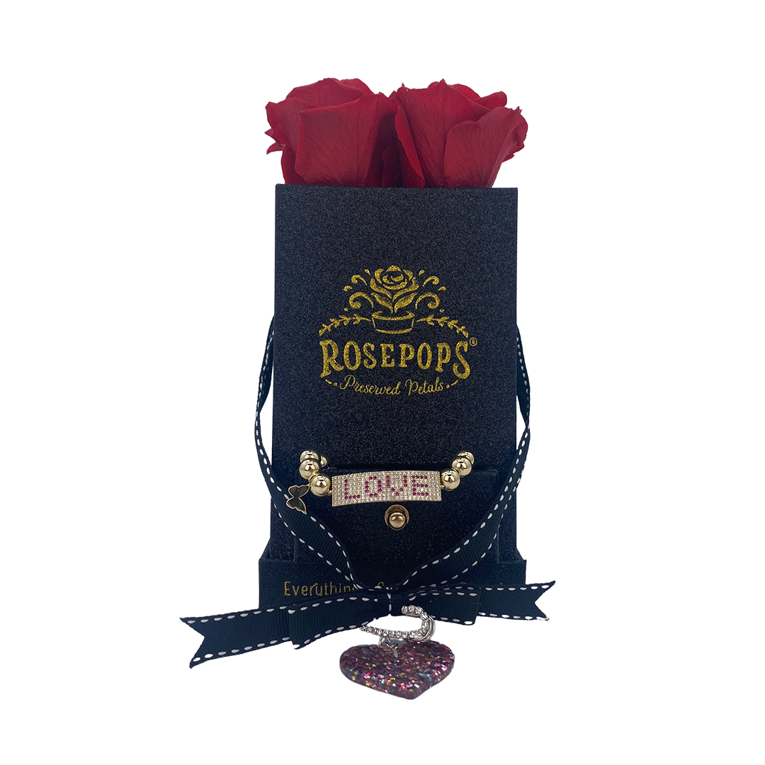 A drawer at the bottom of the box opens to reveal a custom Gold Plated pavé “Love” bracelet designed by renowned jeweler, Rachie Shnay. A hint of Red Carpet Rose Arosatherapy is the perfect finishing touch for this sophisticated gift that keeps on giving. And giving…