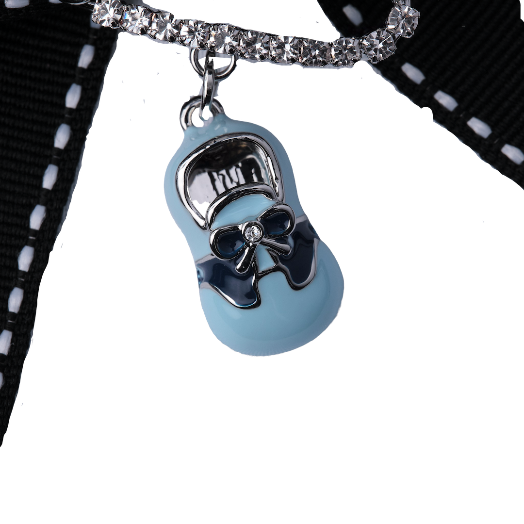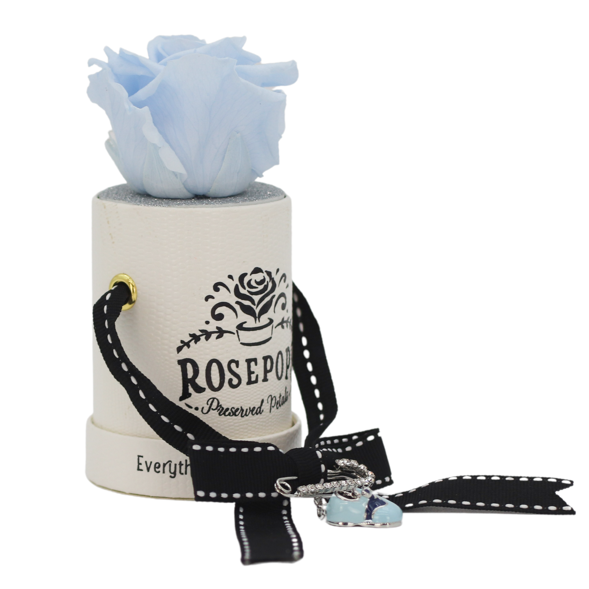 Adorned with an enamel baby shoe charm, this single blue rose delights in white vegan leather which blends beautifully with any nursery decor!