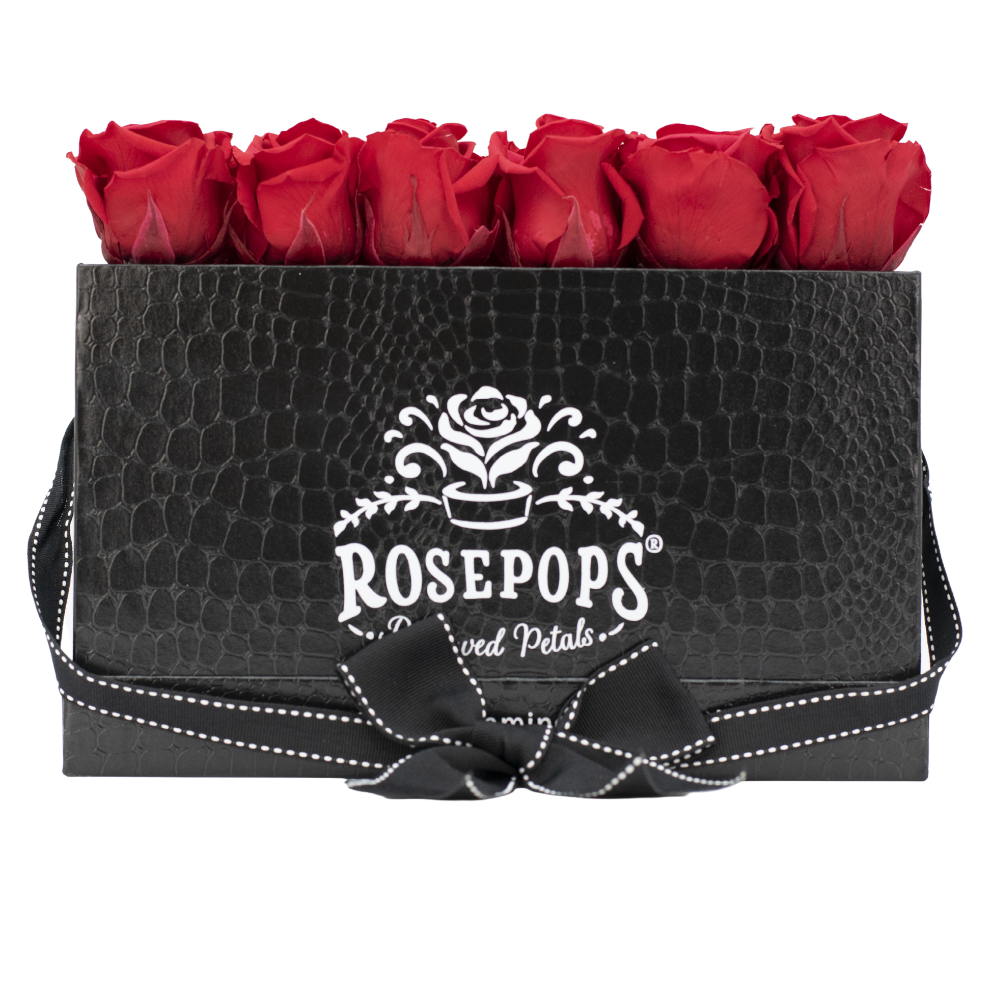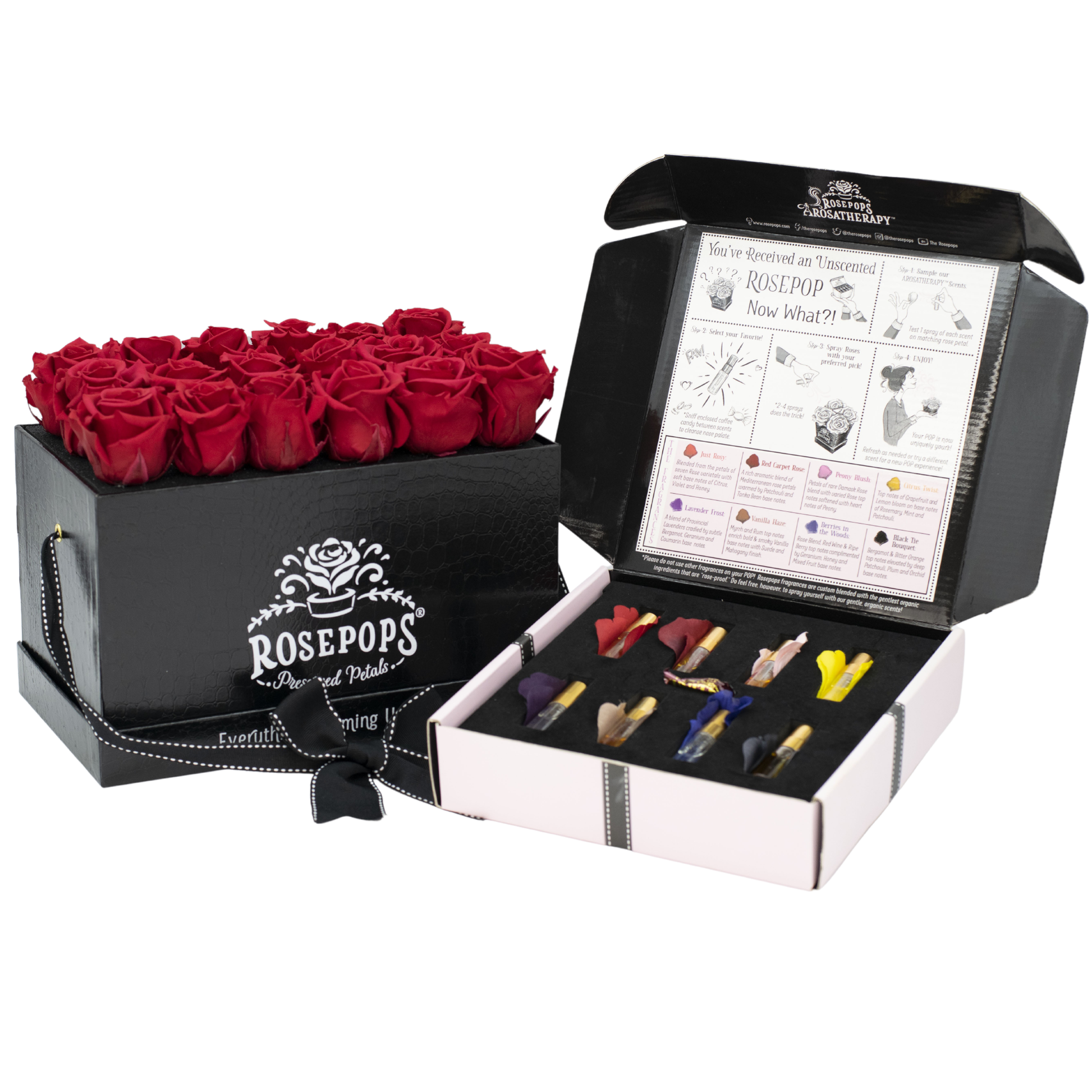 Eighteen enchanting Cherry Crush blooms artfully arranged in rich Black mock crocodile are the perfect pairing for an over the POP gifting experience! For the ultimate in personalized gifting, these preserved petals have been left unscented, and are accompanied with our luxurious Arosatherapy Sampler Set. Your loved one will be able to select their favorite of our custom blended fragrances and with 2-3 sprays to the roses, customize their POP to their sense's delight!