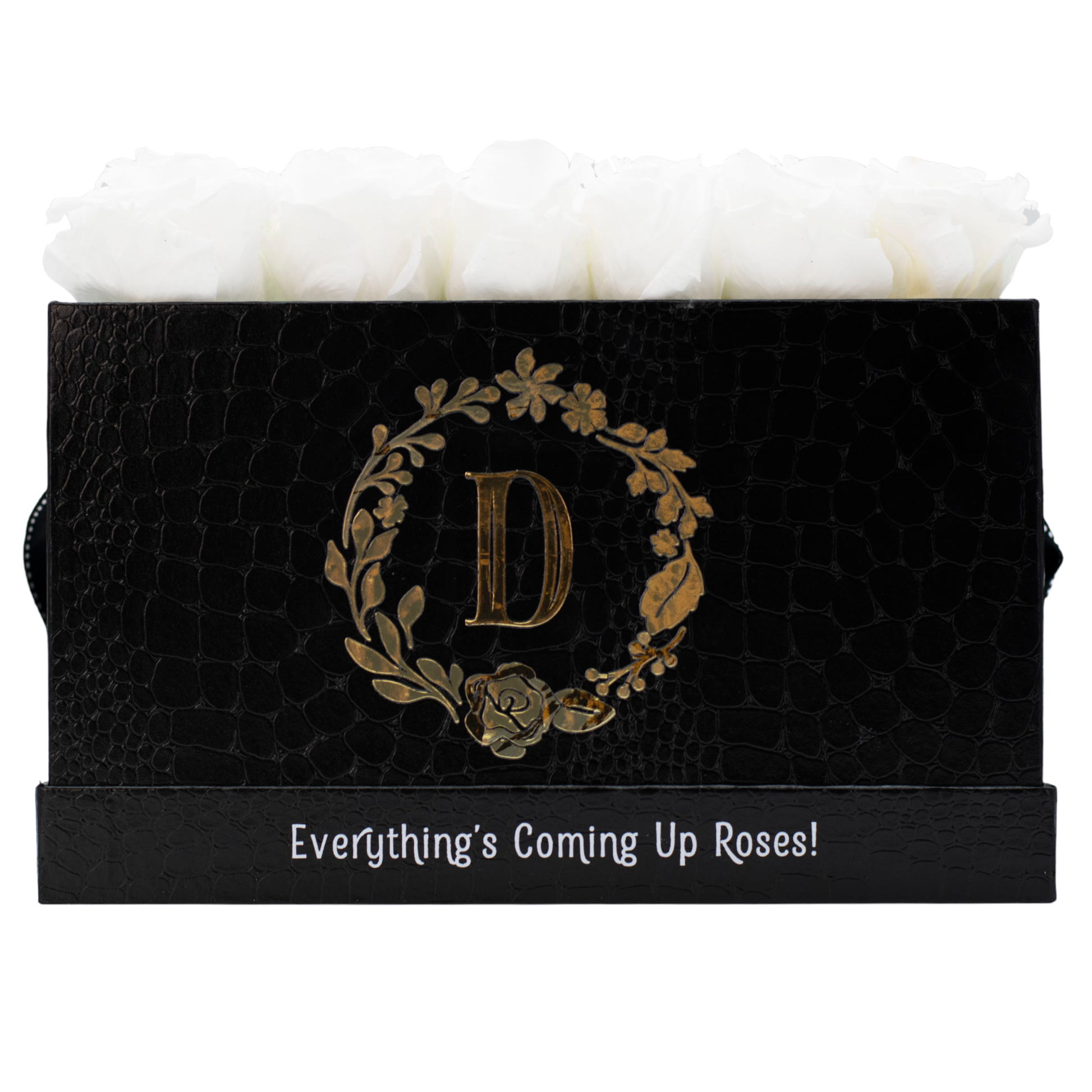 One dozen magnificent true white roses artfully arranged in rich black mock crocodile are the perfect pairing for any lucky loved one. Boasting a gleaming gold personalized monogram, these preserved petals are sure to show your special someone just how much they are appreciated.