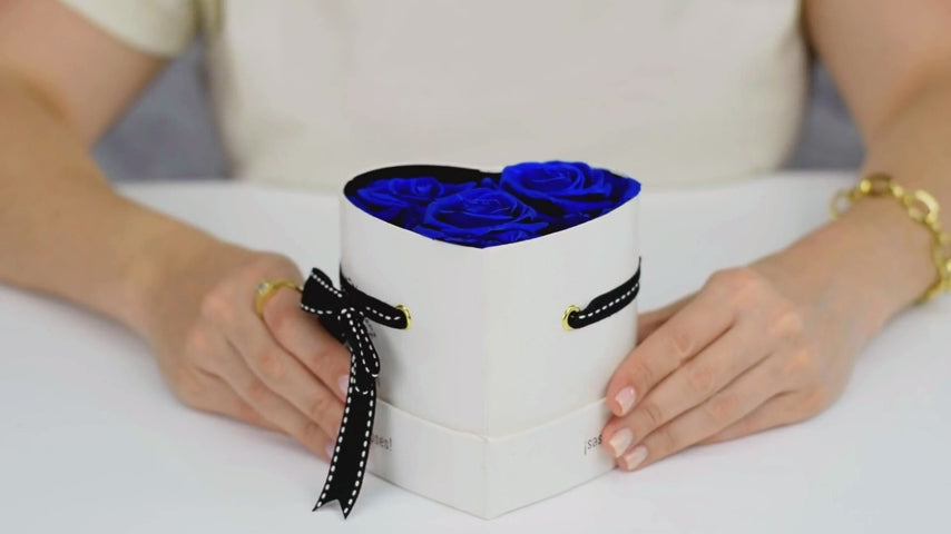 3 bold Blueberry Blast roses in our rich White mock croc heart promise blue skies ahead! "To Love, Laughter and Happily Ever After" monogram delivers your message of hope and joy, finished with a rainbow charm that adds the perfect touch to any blue sky!