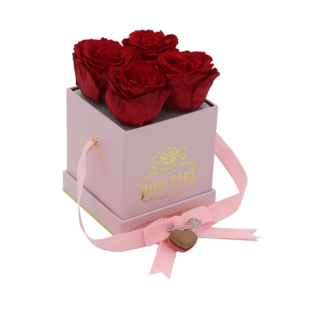 Four red roses in a petal pink box adorned with a golden heart of sweet love. This POP will wow with a heart shaped French Macaron charm which looks good enough to eat!!