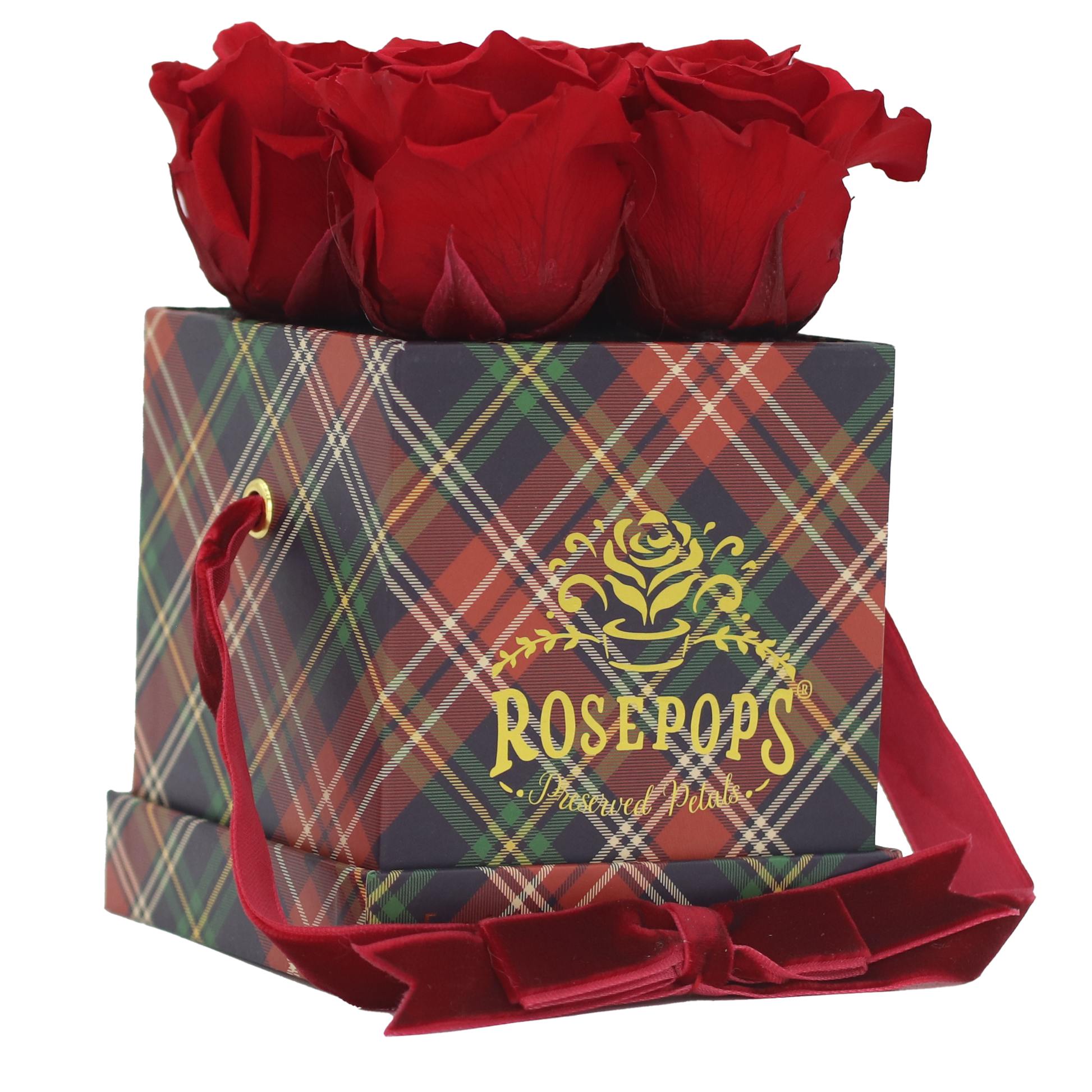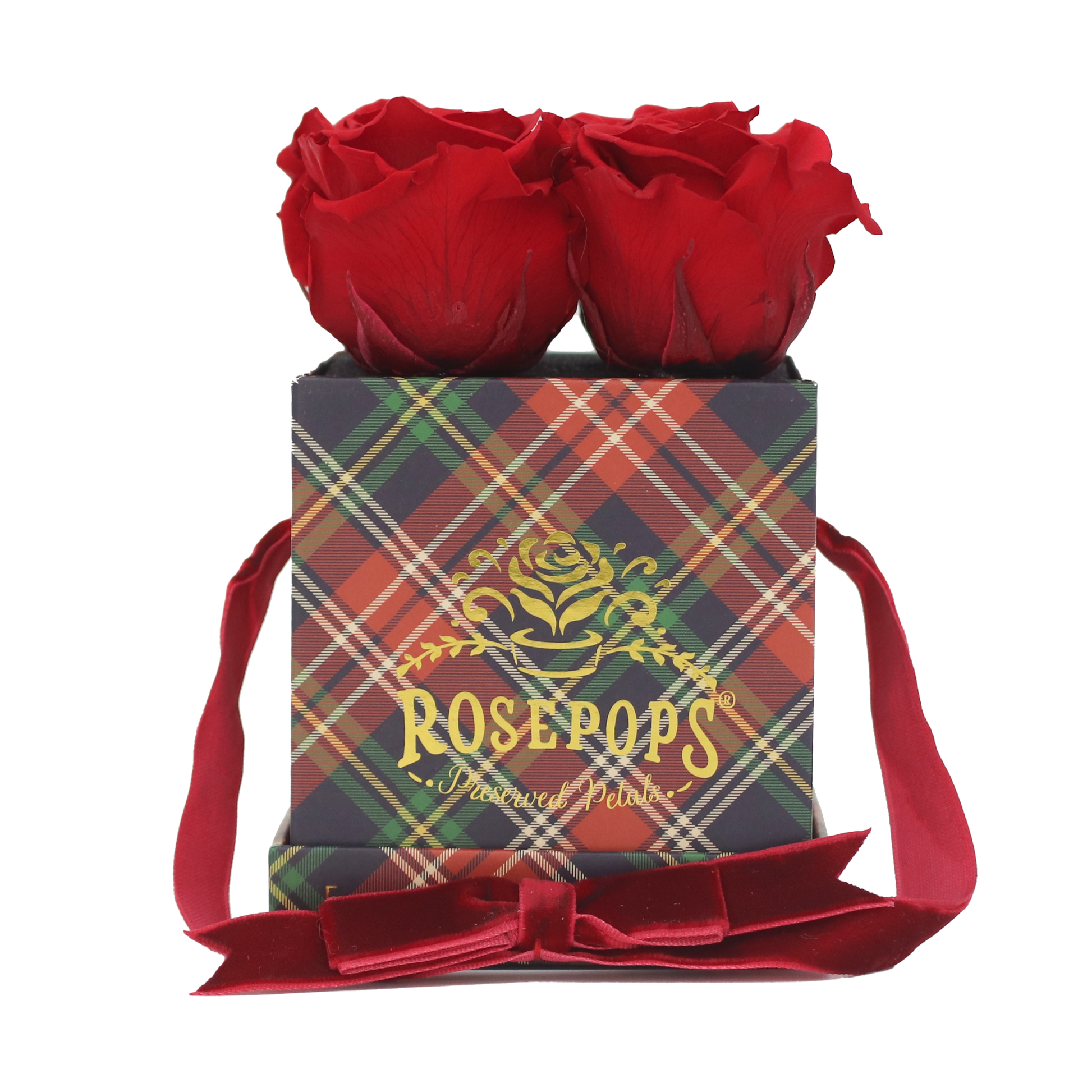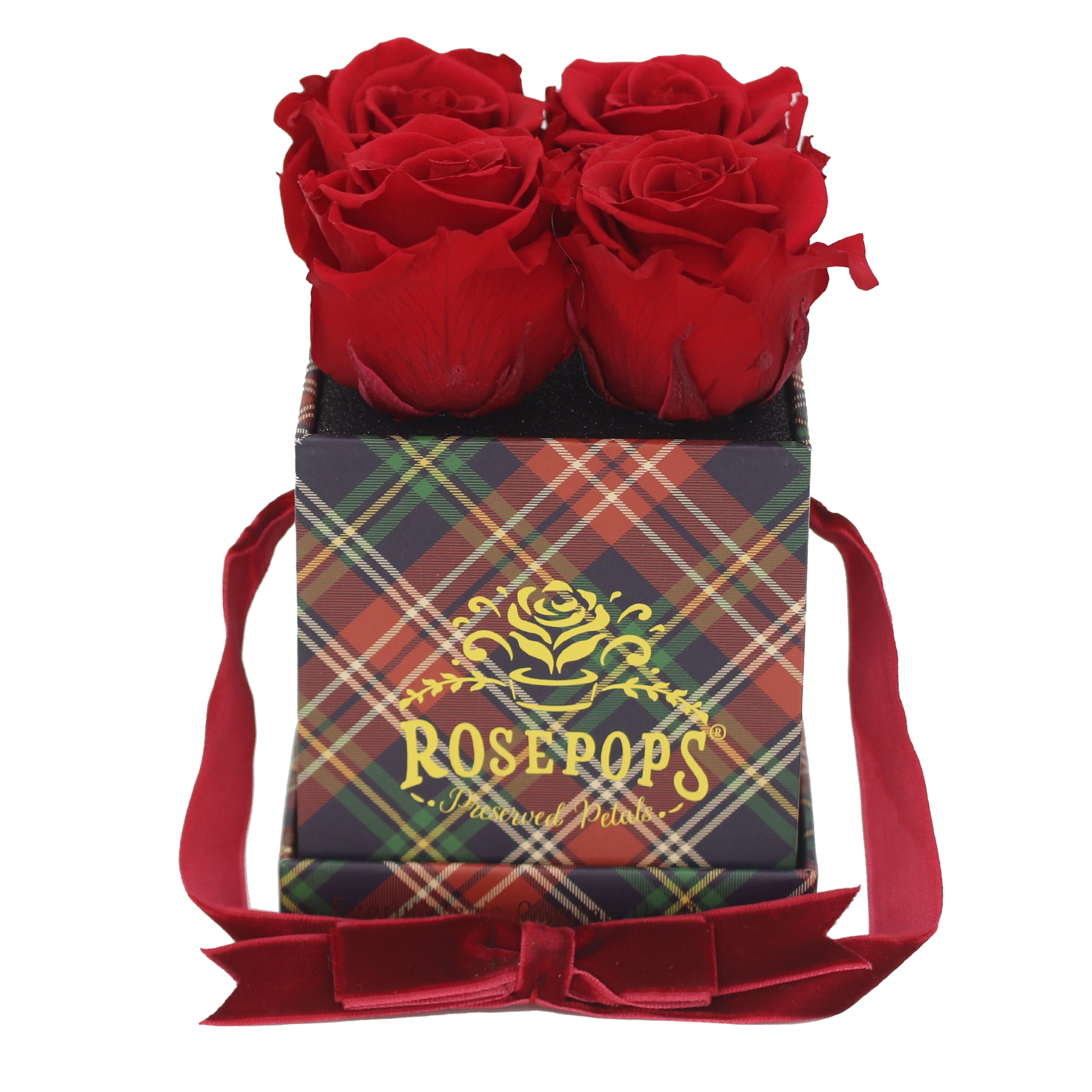 Four captivating Cherry Crush Blooms are sure to delight nestled in rich red plaid which will enhance any decor! These preserved petals have been scented with our custom blended Red Carpet Rose Arosatherapy fragrance, which embodies a perfect synthesis of Mediterranean rose petals warmed by Patchouli and Tonka Bean base notes.