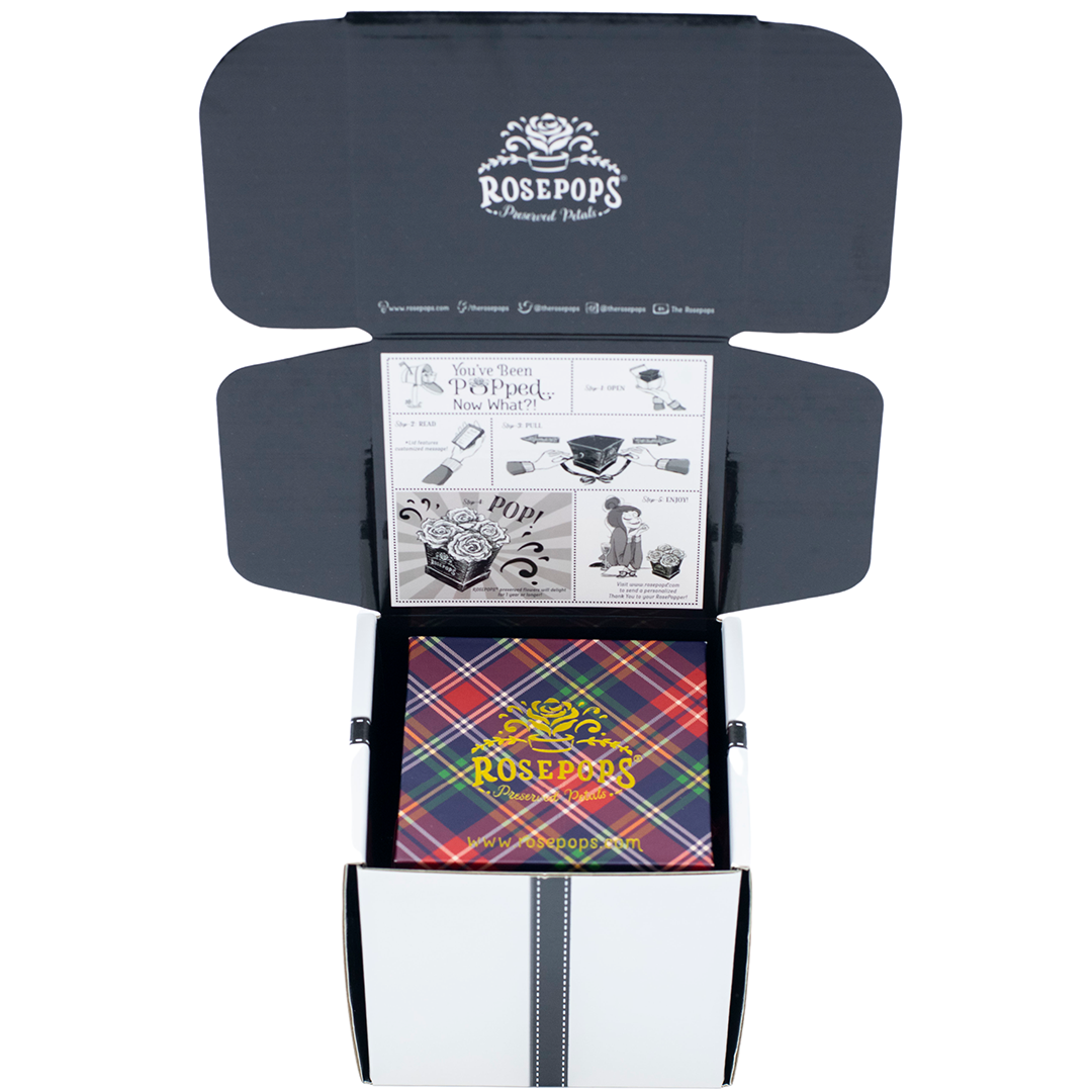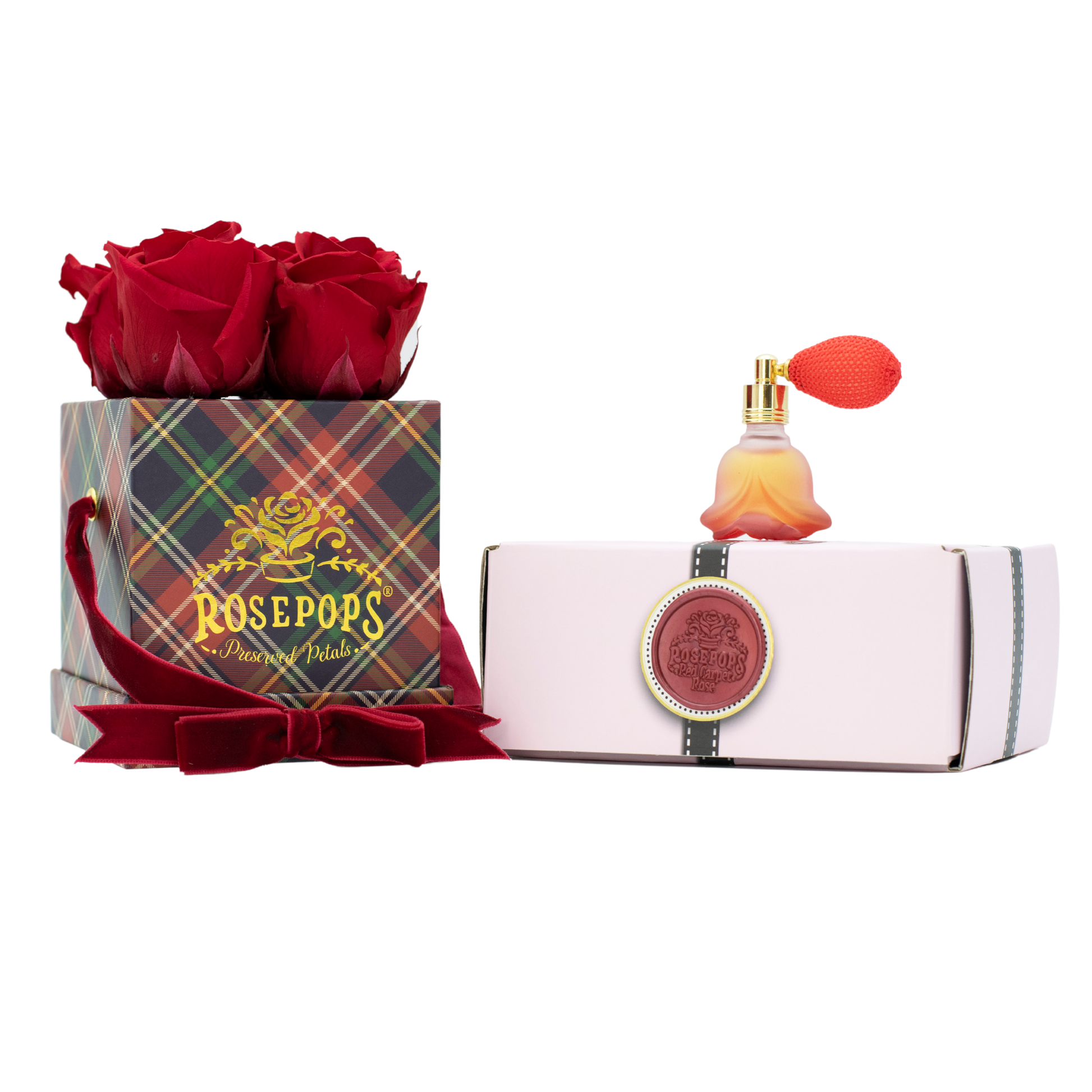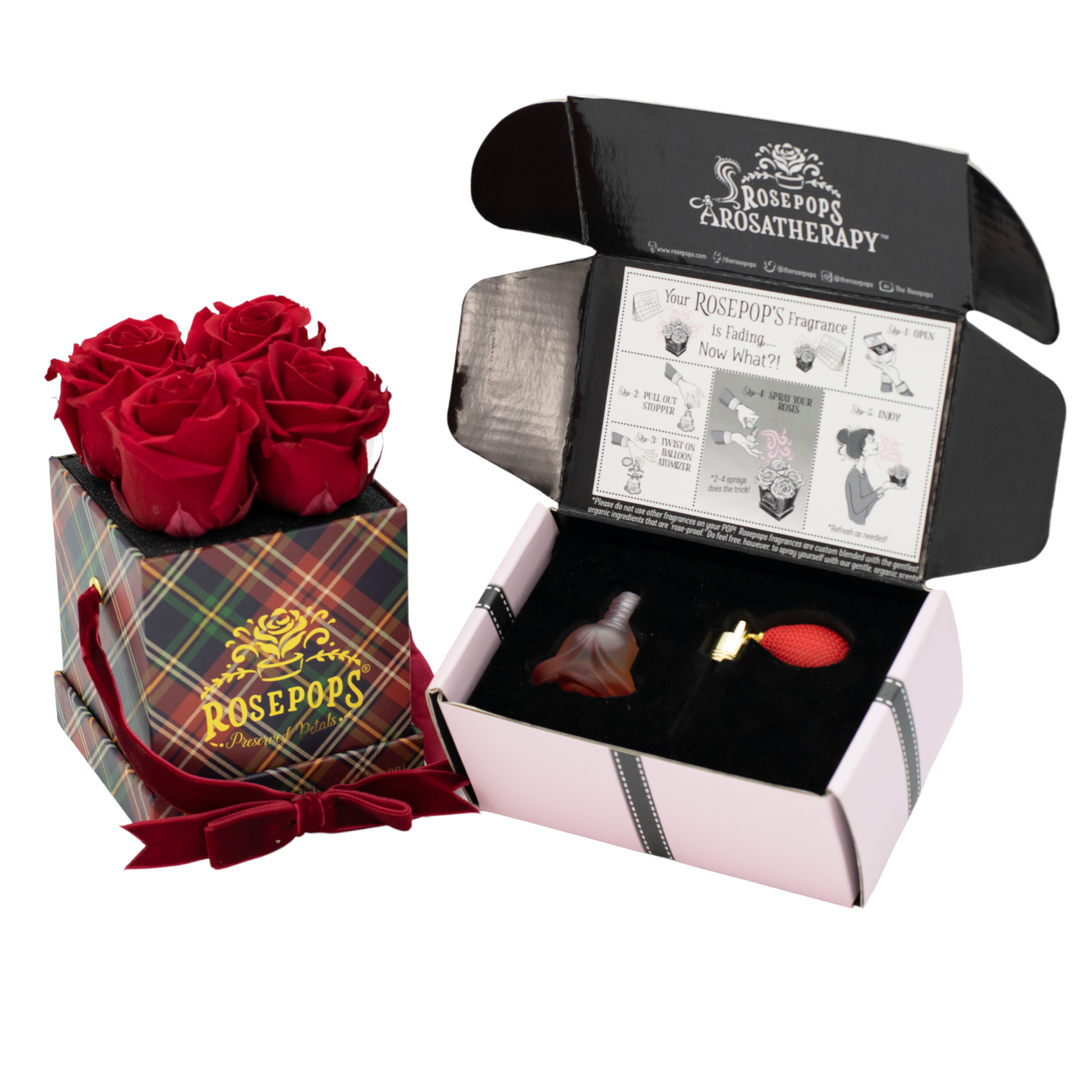 Four captivating Cherry Crush Blooms are sure to delight nestled in rich red plaid which will enhance any decor! These preserved petals have been scented with our custom blended Red Carpet Rose Arosatherapy fragrance, which embodies a perfect synthesis of Mediterranean rose petals warmed by Patchouli and Tonka Bean base notes.