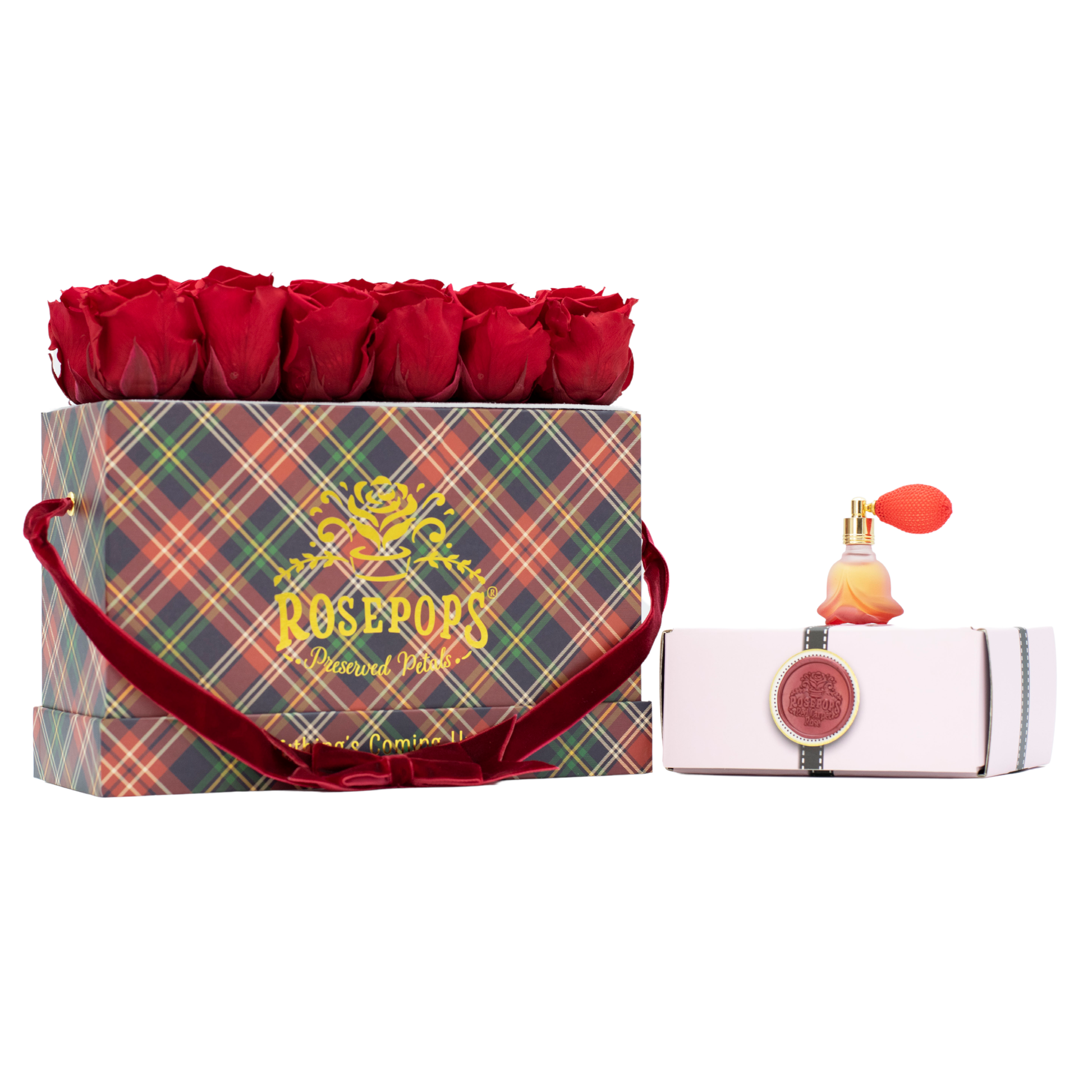 Twelve captivating Cherry Crush blooms make the perfect dozen, nestled in rich red plaid which will enhance any decor! These preserved petals have been scented with our custom blended Red Carpet Rose Arosatherapy fragrance, which embodies a perfect synthesis of Mediterranean rose petals warmed by Patchouli and Tonka Bean base notes.