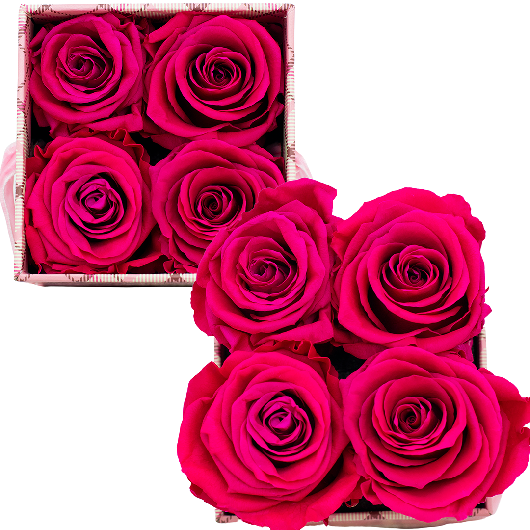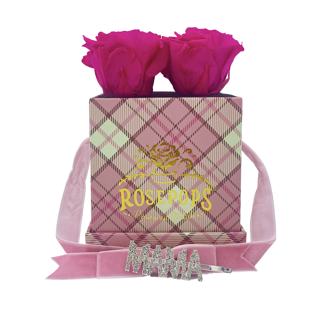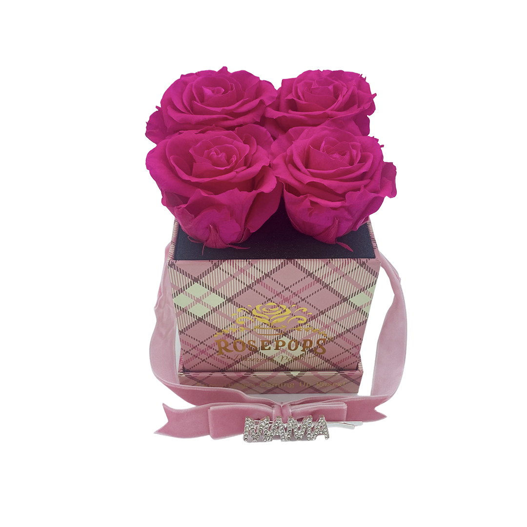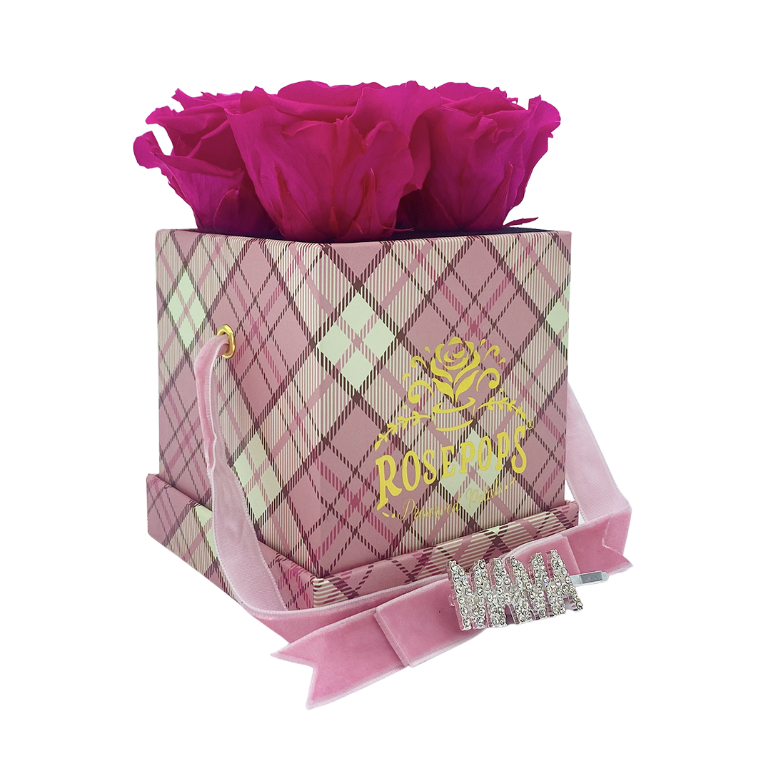 Four Raspberry Blooms in a Pink Plaid Box adorned with a golden "Happy Mother's Day" sentiment!