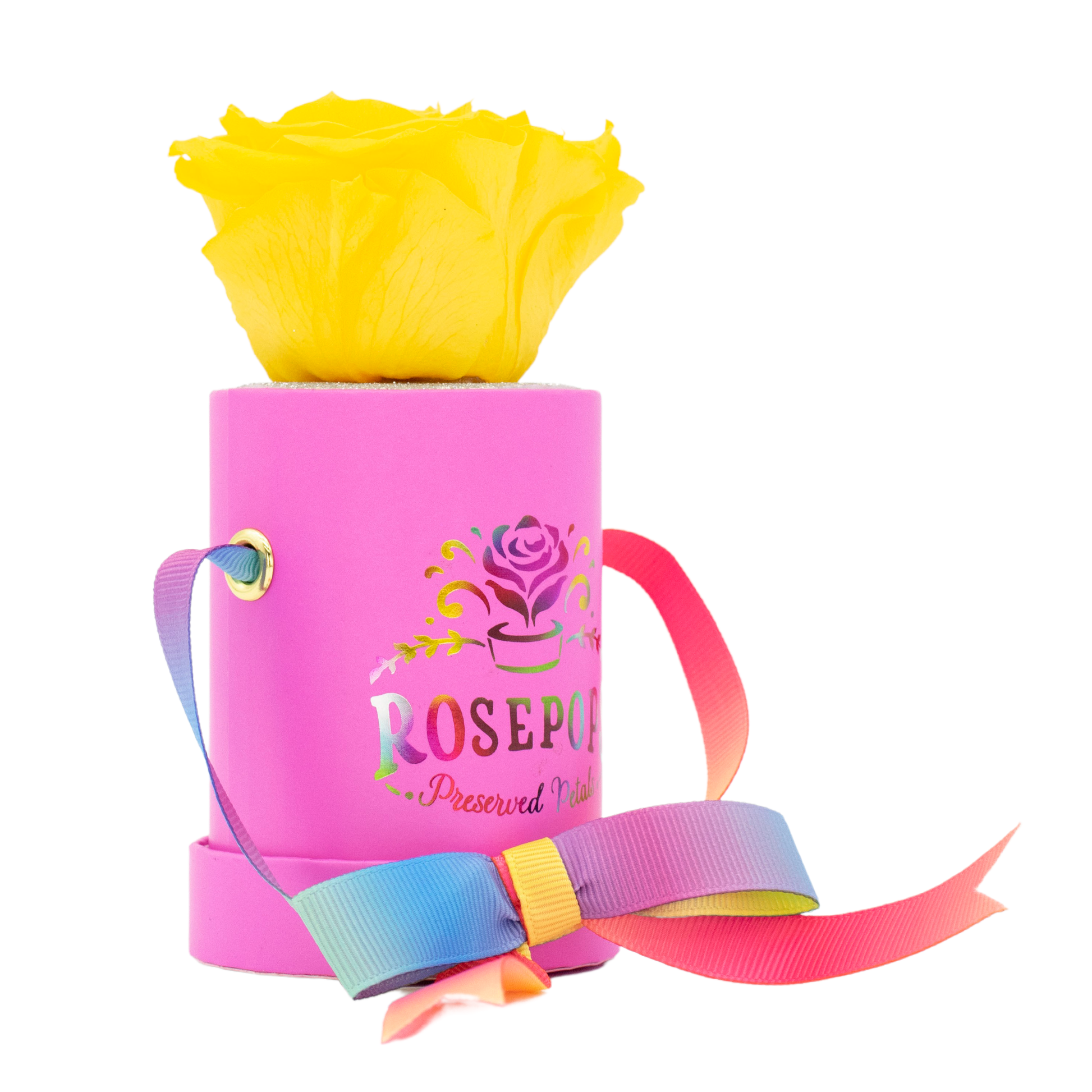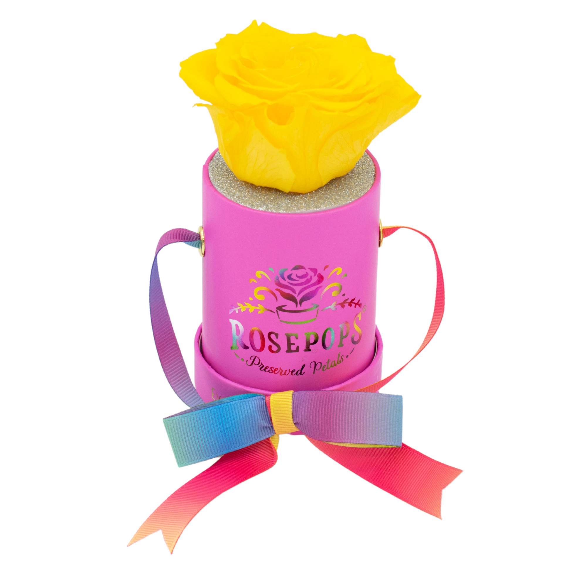 A single perfect Lemon Sorbet blossom POPs perfectly from our Hot Pink box. Your loved one is sure to think you are sensational for sending this bright petite POP.