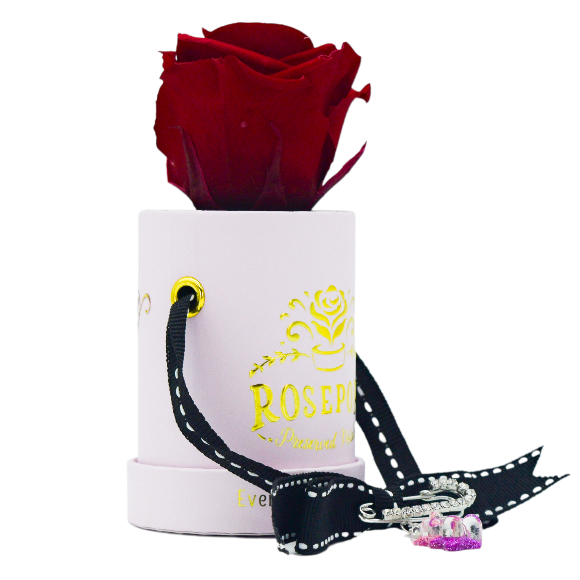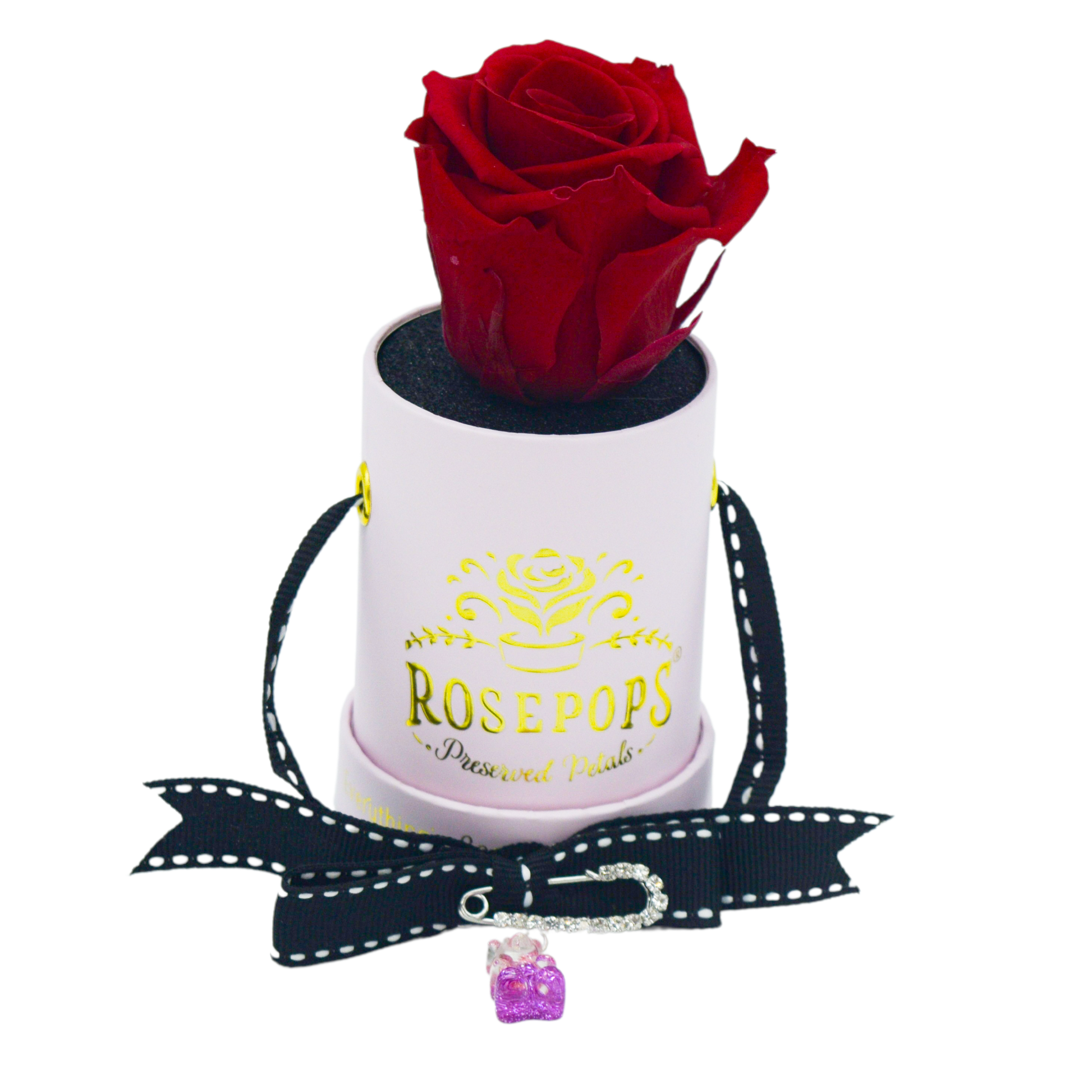 A single Cherry Red bloom brings sweet love with a faux gummy bear and heart charm. The golden “I love you” design is whimsical and elegant set against our petal pink box which is sure to bring all the feels to your sweet Valentine.