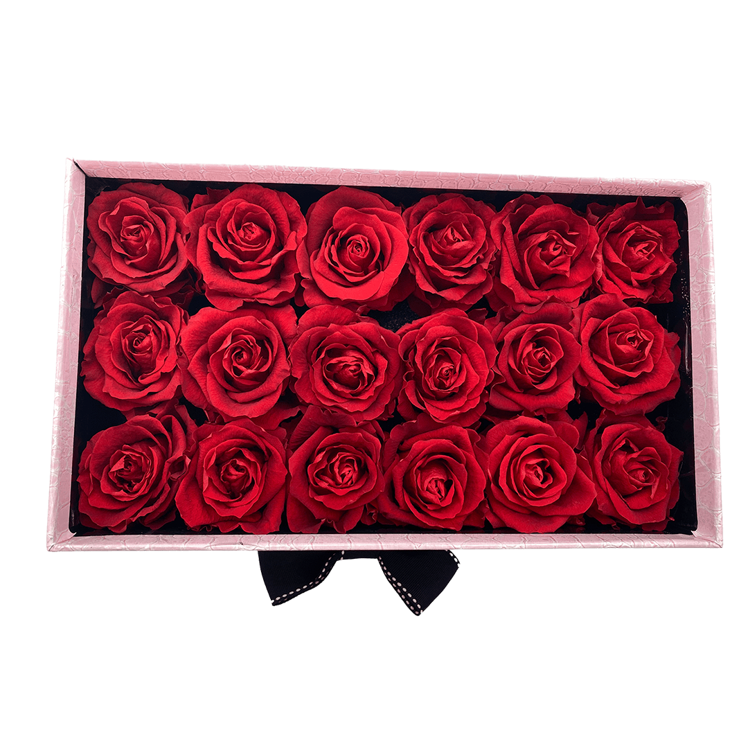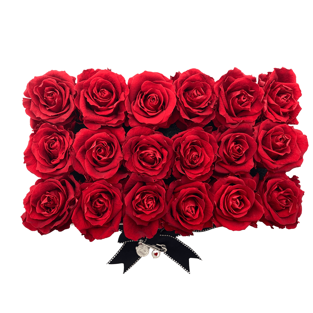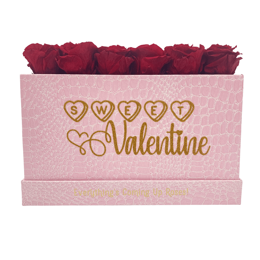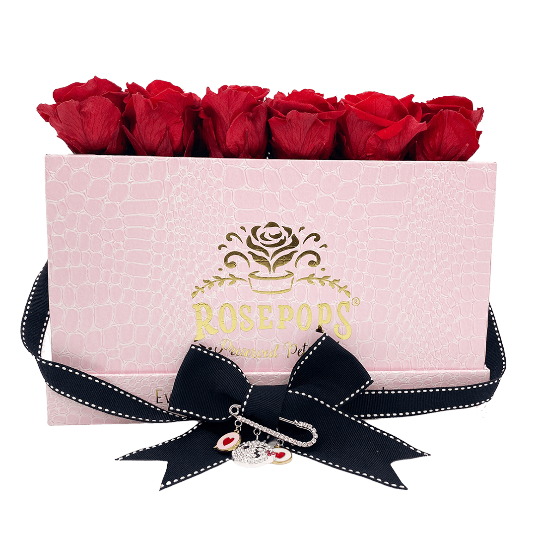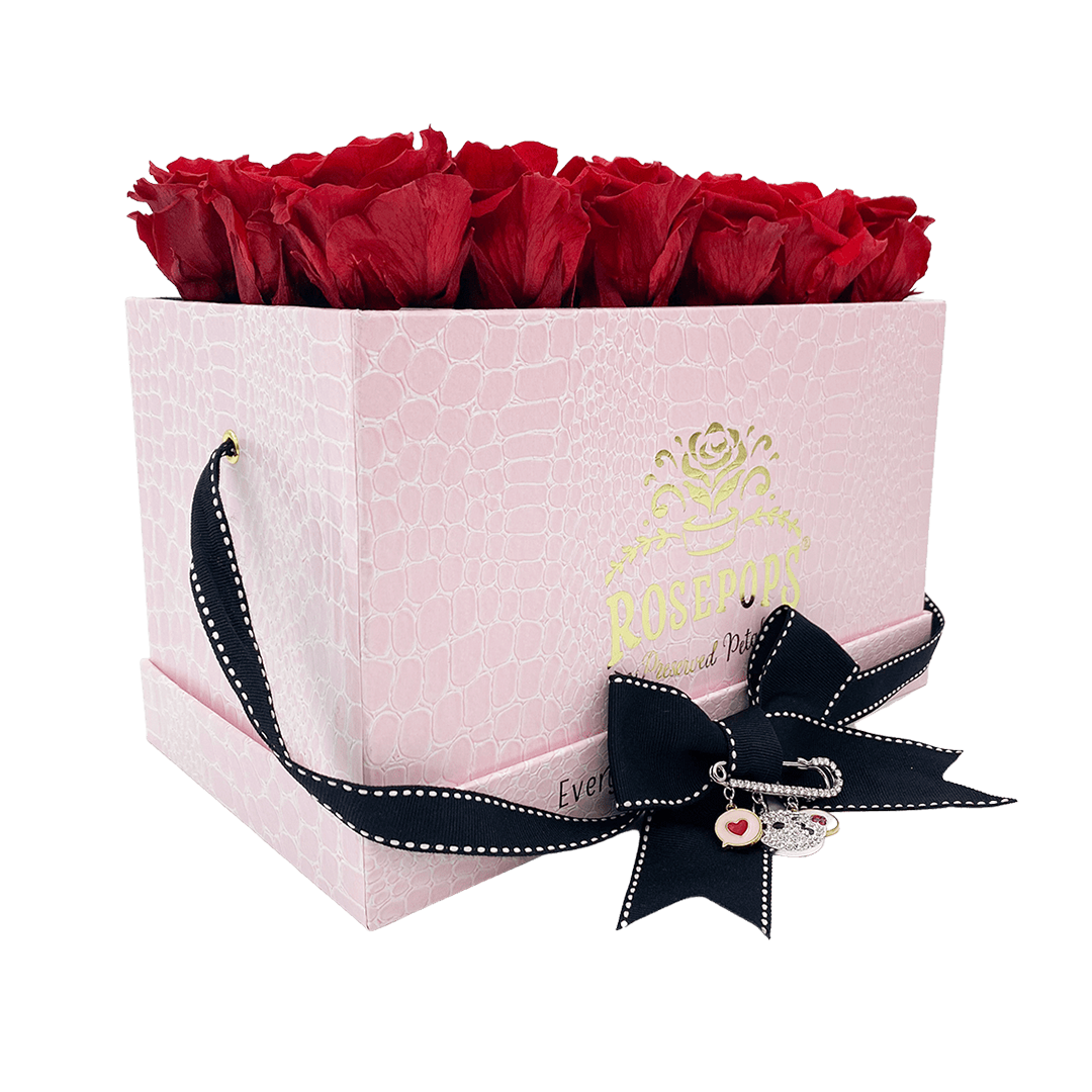 Eighteen luscious Cherry Red blooms are a total showPOP’per housed in rich pink mock crocodile.