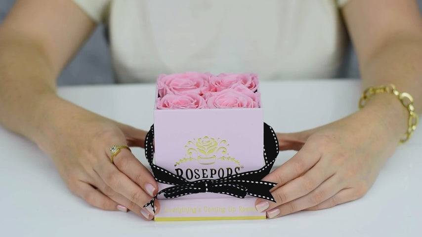 Four captivating Cotton Candy Blooms in a petal soft blush Pink box are sure to be loved! These preserved petals have been scented with our custom blended Peony Blush Arosatherapy fragrance, which embodies a perfect synthesis of petals of the rare Damask Rose blended with varied Rose top notes and softened with heart notes of Peony.
