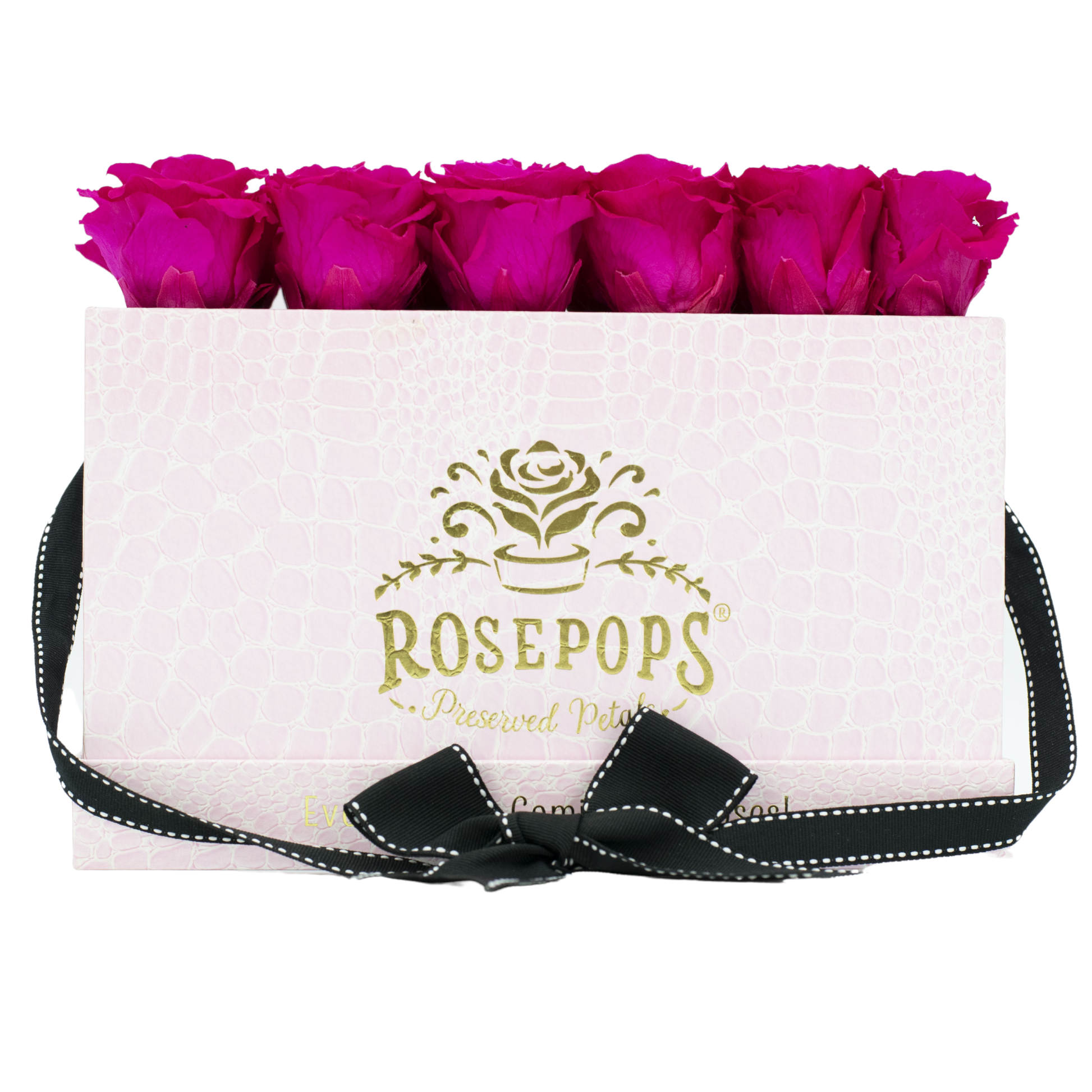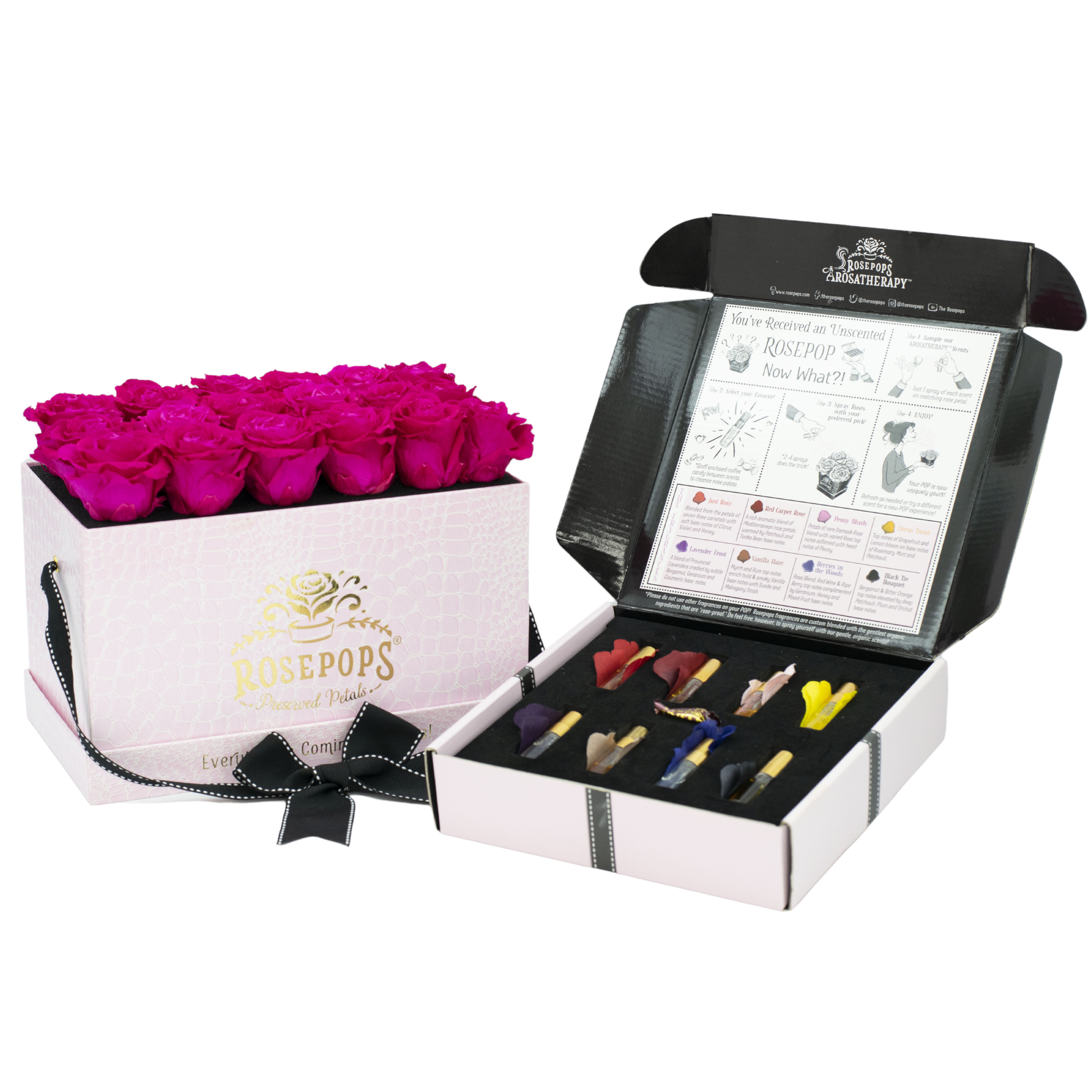 Eighteen ravishing Raspberry blooms artfully arranged in petal Pink mock crocodile are the perfect pairing for an over the POP gifting experience! For the ultimate in personalized gifting, these preserved petals have been left unscented, and are accompanied with our luxurious Arosatherapy Sampler Set. Your loved one will be able to select their favorite of our custom blended fragrances and with 2-3 sprays to the roses, customize their POP to their sense's delight!