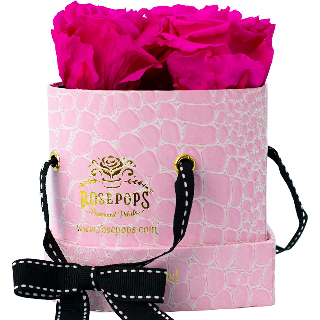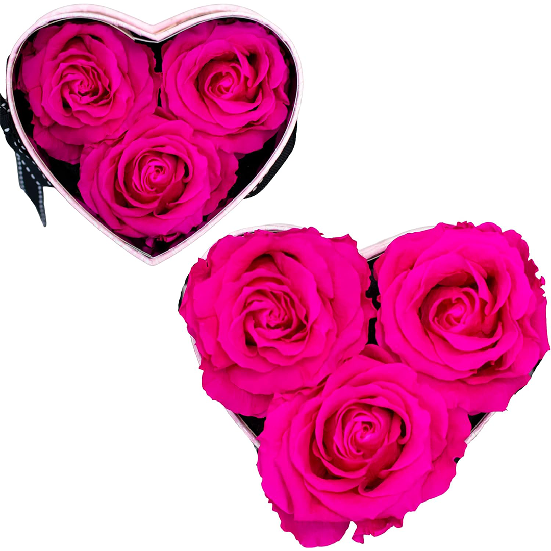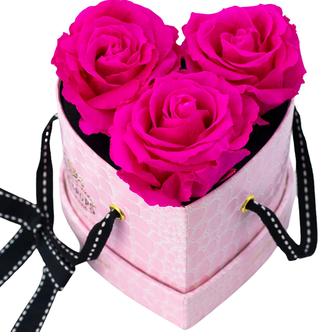 Three ravishing Raspberry Blooms in a Petal Pink mock crocodile heart shaped box are sure to turn up the charm! These preserved petals have been scented with our custom blended Red Carpet Rose Arosatherapy fragrance, which embodies a perfect synthesis of Mediterranean rose petals warmed by Patchouli and Tonka Bean base notes.