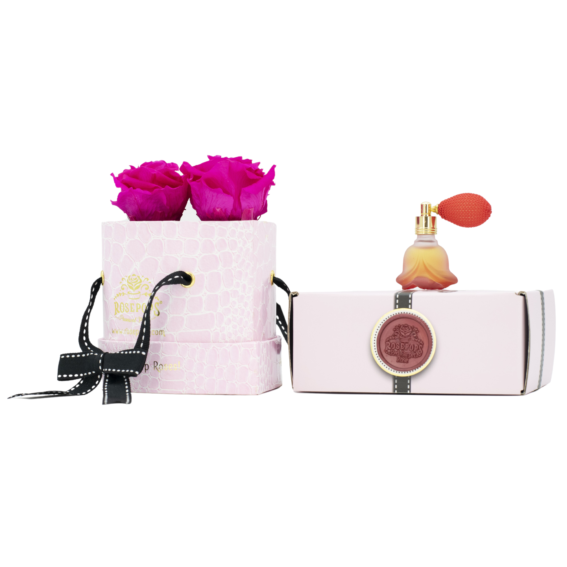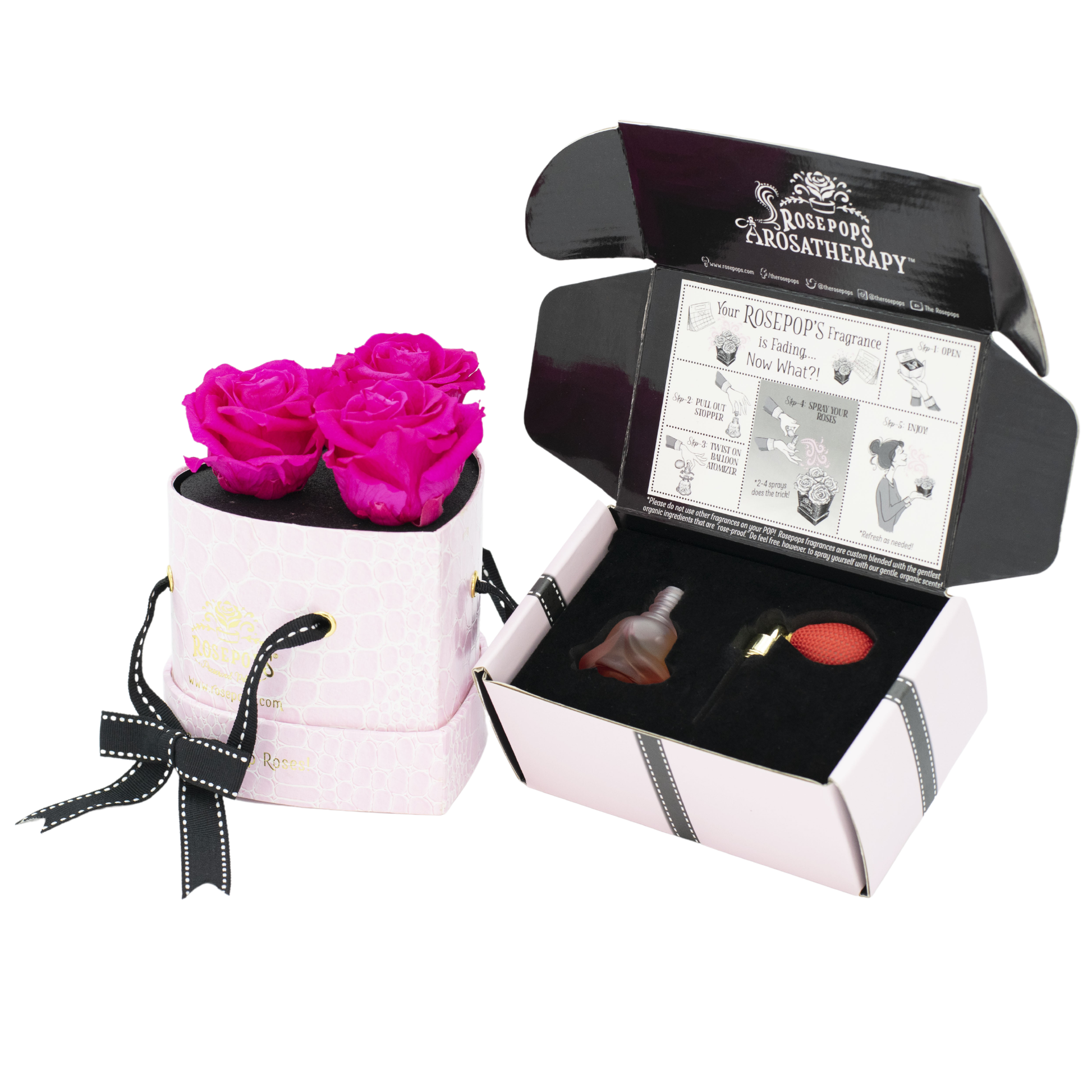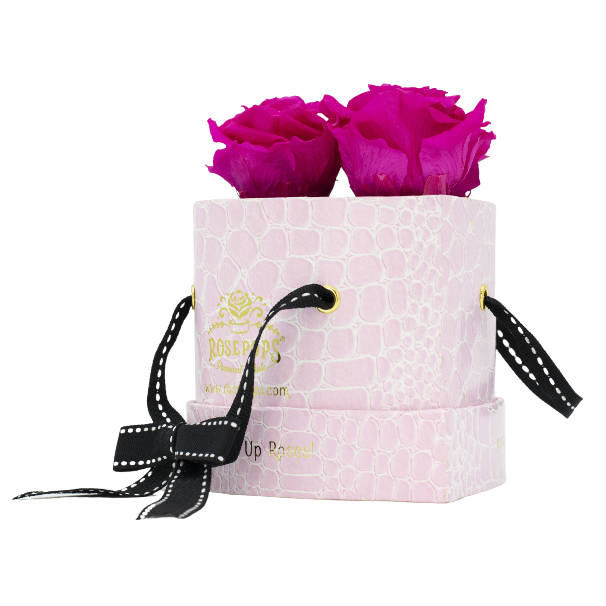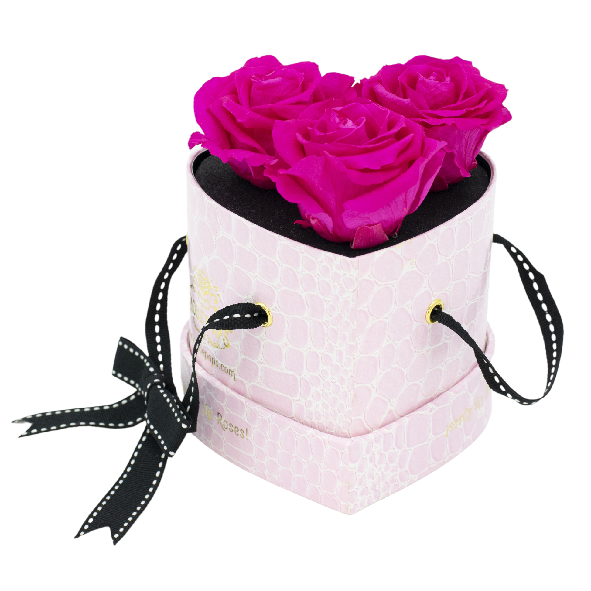 Three ravishing Raspberry Blooms in a Petal Pink mock crocodile heart shaped box are sure to turn up the charm! These preserved petals have been scented with our custom blended Red Carpet Rose Arosatherapy fragrance, which embodies a perfect synthesis of Mediterranean rose petals warmed by Patchouli and Tonka Bean base notes.
