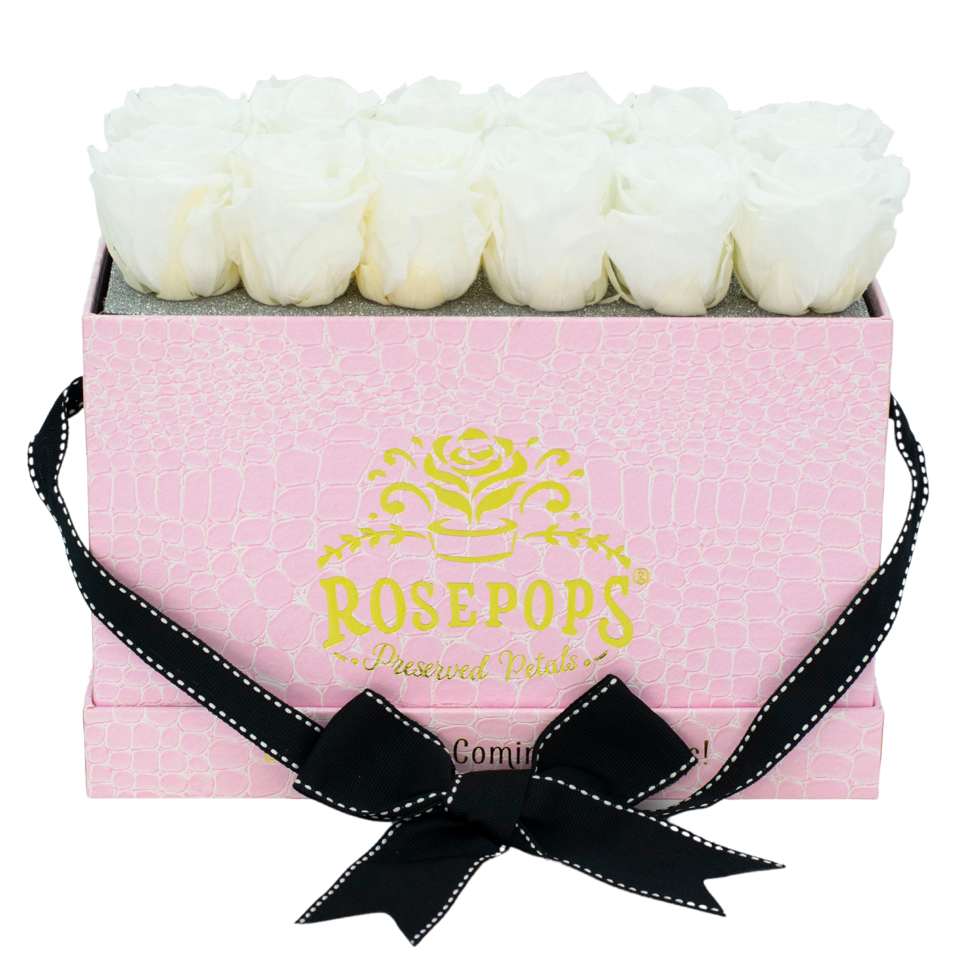 One dozen magnificent white roses artfully arranged in luxurious pink mock crocodile are the perfect pairing for any lucky loved one. Boasting a gleaming gold personalized monogram, these preserved petals are sure to show your special someone just how much they are appreciated.
