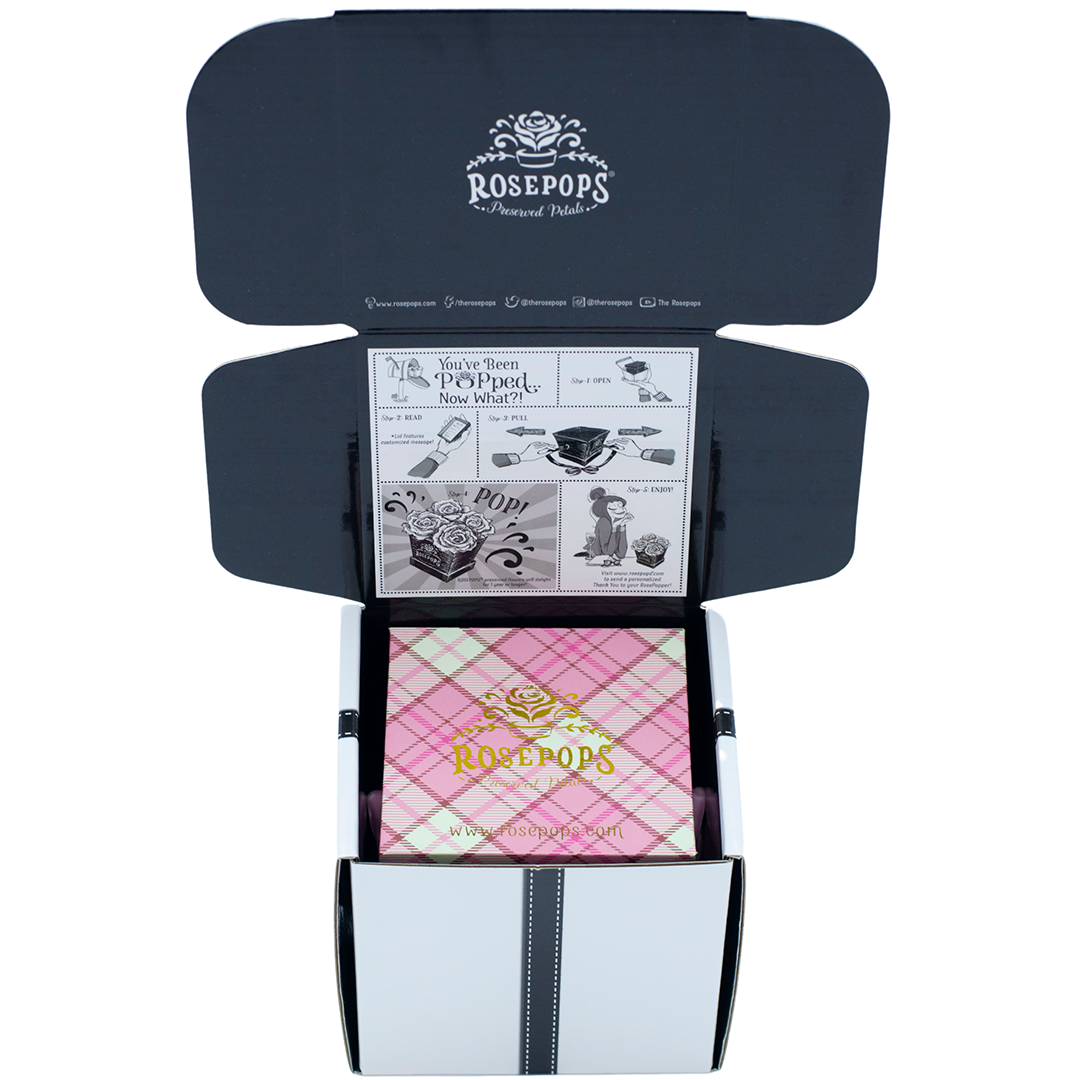 Four ravishing Raspberry blooms look especially smart when POP'ped out of our signature Pink Plaid box! One of our customers' top "picks" these preserved petals have been scented with our custom blended Black Tie Bouquet Arosatherapy fragrance, which embodies a perfect synthesis of Bergamot and Bitter Orange top notes elevated by deep Patchouli, Plum and Orchid base notes.