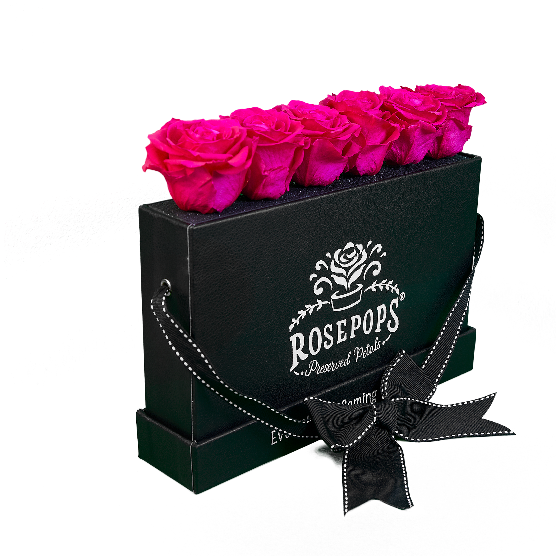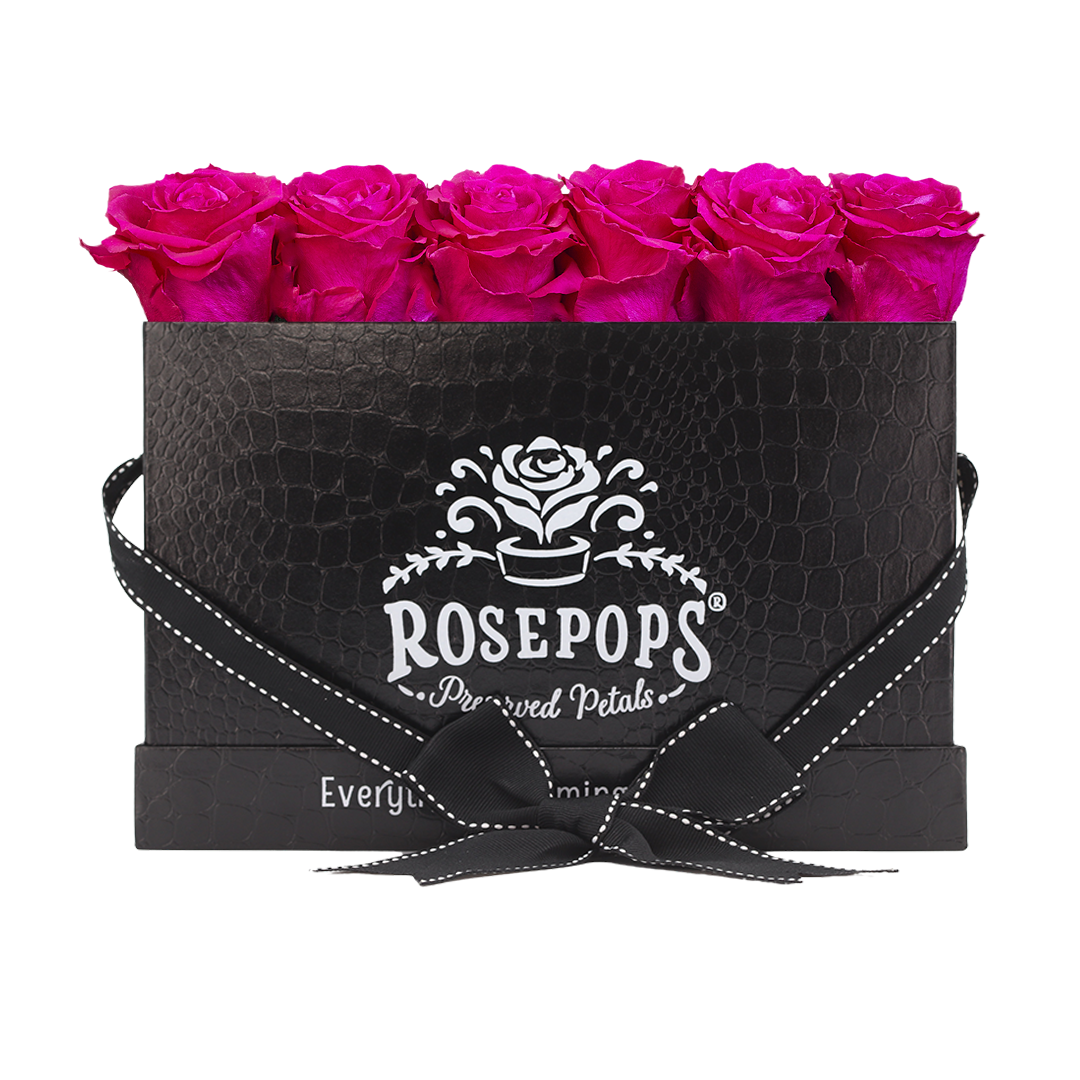 Six Raspberry blooms housed in a rich, Black Mock Crocodile box, make this slimcut POP the perfect pick! Add a personal note to your loved one who will cherish this Sassy selection. This six pack would be scented with our Just Rosy fragrance.