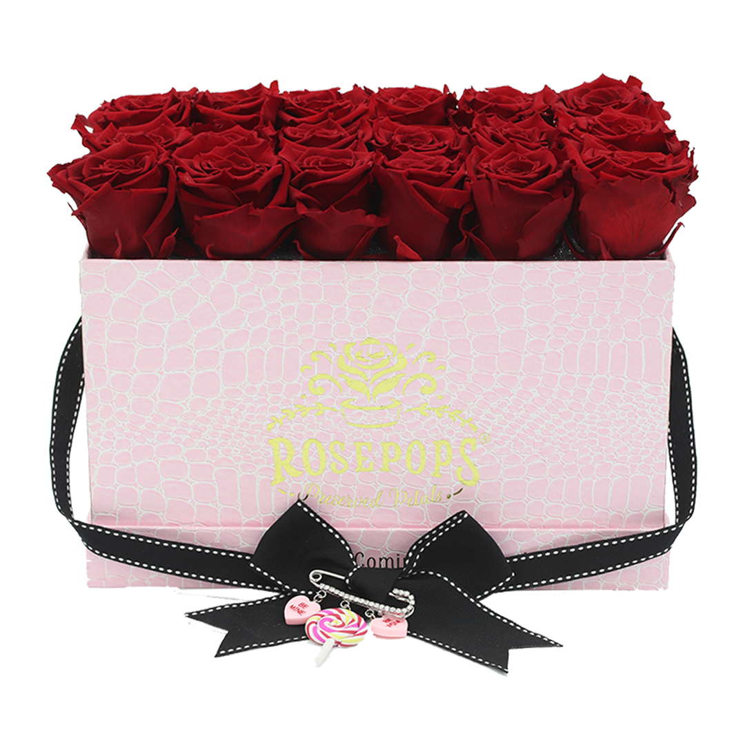 Eighteen swoon-worthy robust red roses POP perfectly in our rich pink mock crocodile box. A trio of sweet charms enrich the golden “Love Sweet Love” sentiment that adorns this premiere POP.