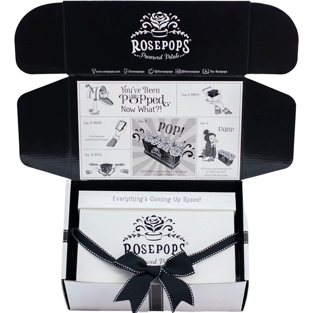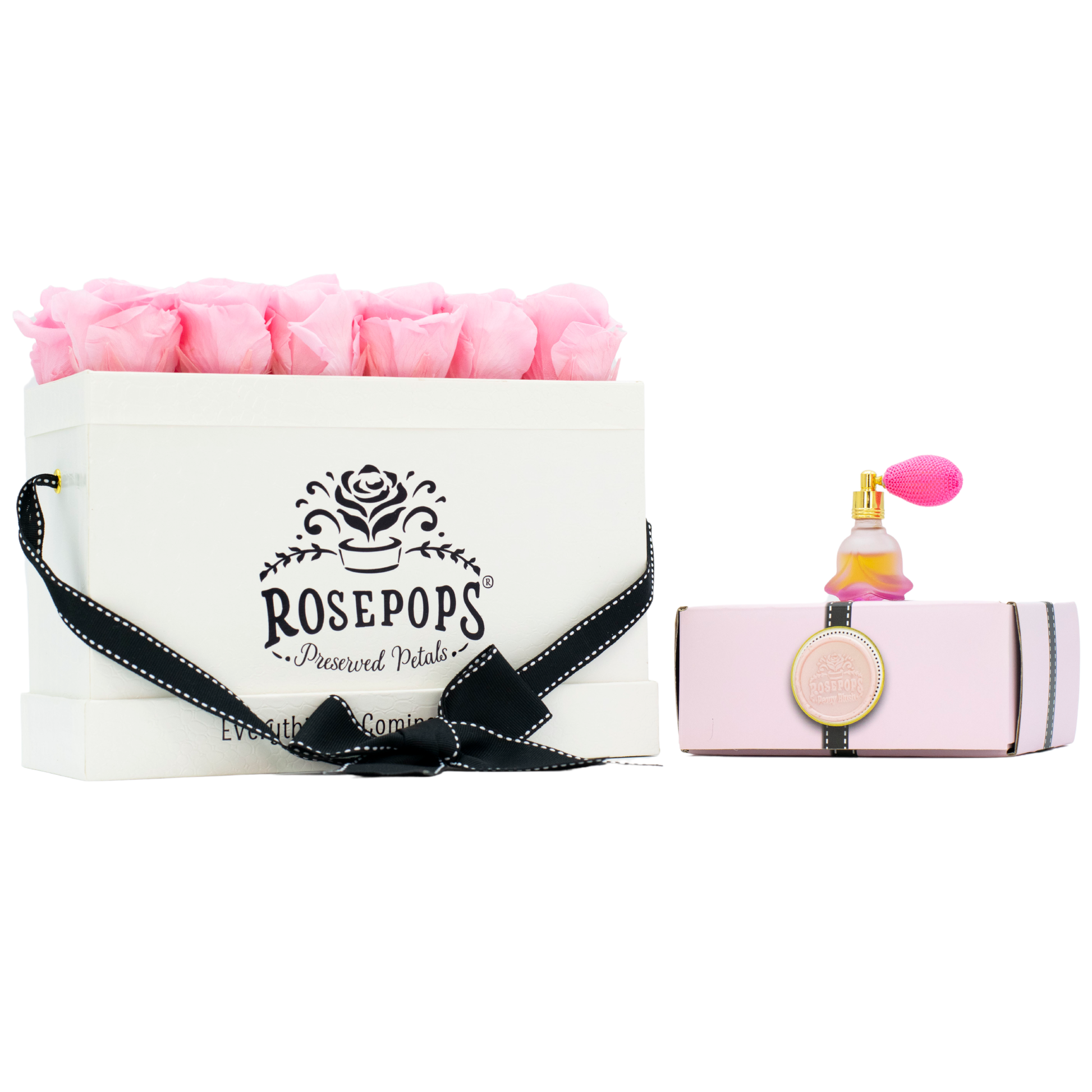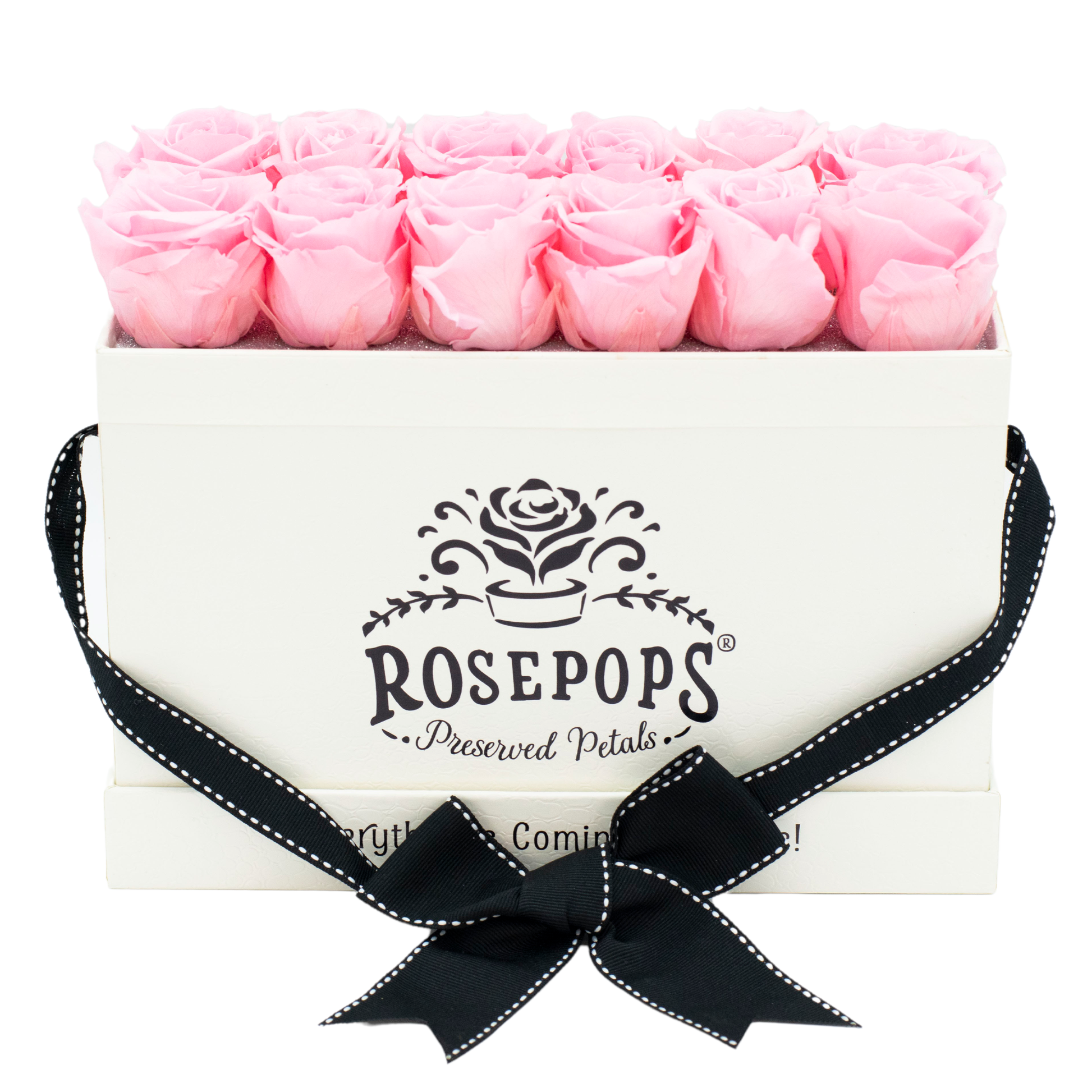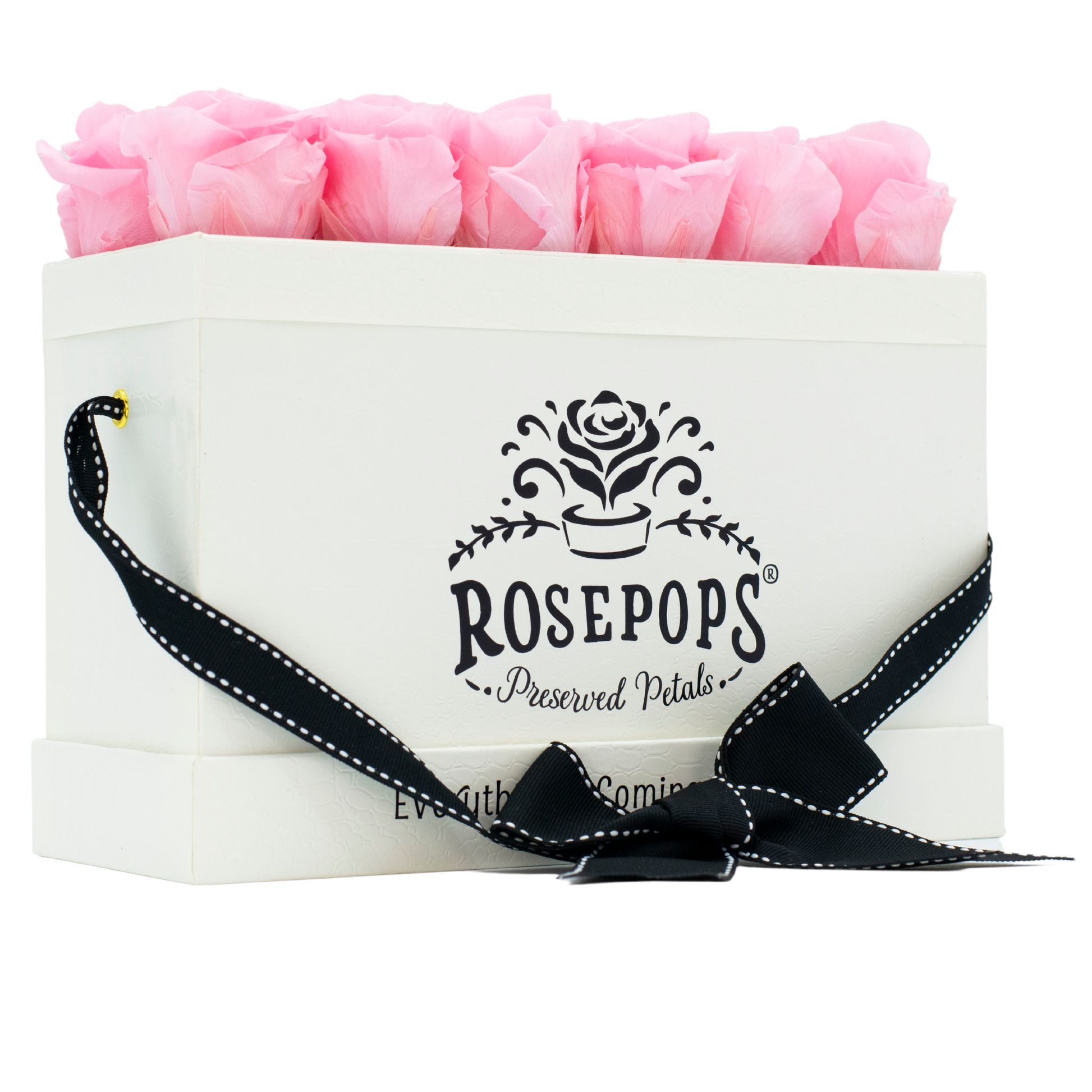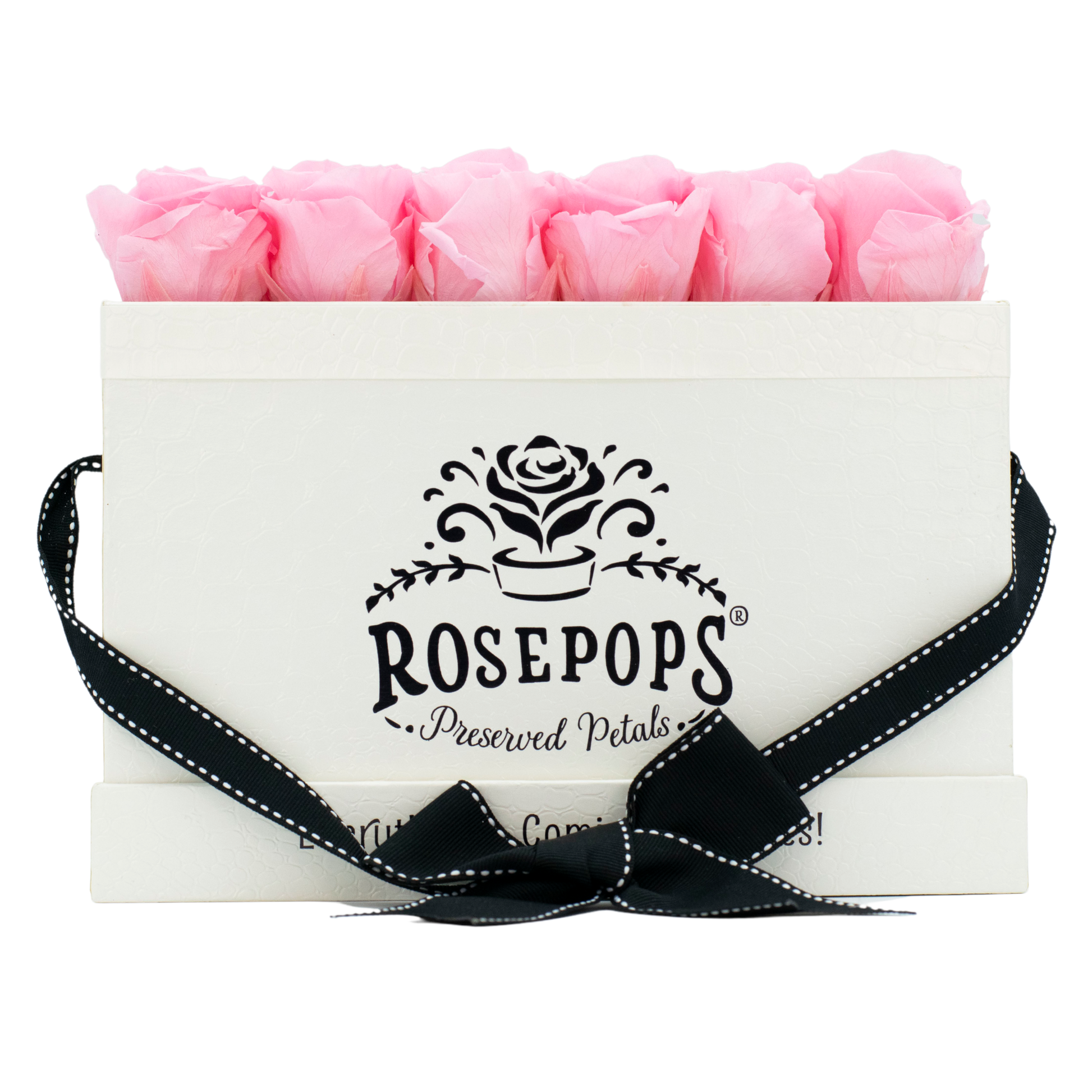 Twelve captivating Cotton Candy Pink blooms in a crisp White mock crocodile box are sure to delight! These preserved petals have been scented with our custom blended Peony Blush Arosatherapy fragrance, which embodies a perfect synthesis of petals of the rare Damask Rose blended with varied Rose top notes and softened with heart notes of Peony.