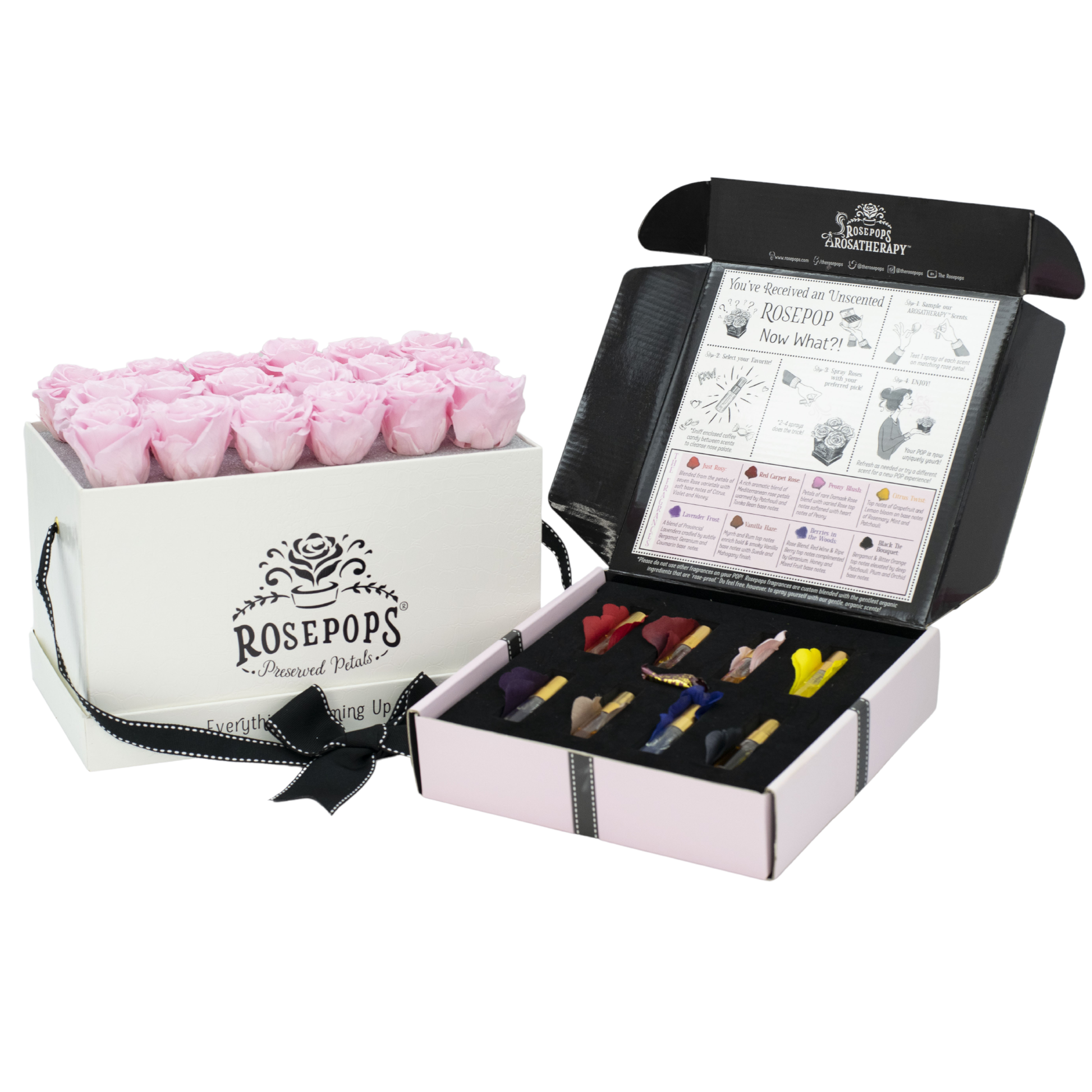 Eighteen captivating Cotton Candy blooms artfully arranged in soft White mock crocodile are the perfect pairing for an over the POP gifting experience! For the ultimate in personalized gifting, these preserved petals have been left unscented, and are accompanied with our luxurious Arosatherapy Sampler Set. Your loved one will be able to select their favorite of our custom blended fragrances and with 2-3 sprays to the roses, customize their POP to their sense's delight!