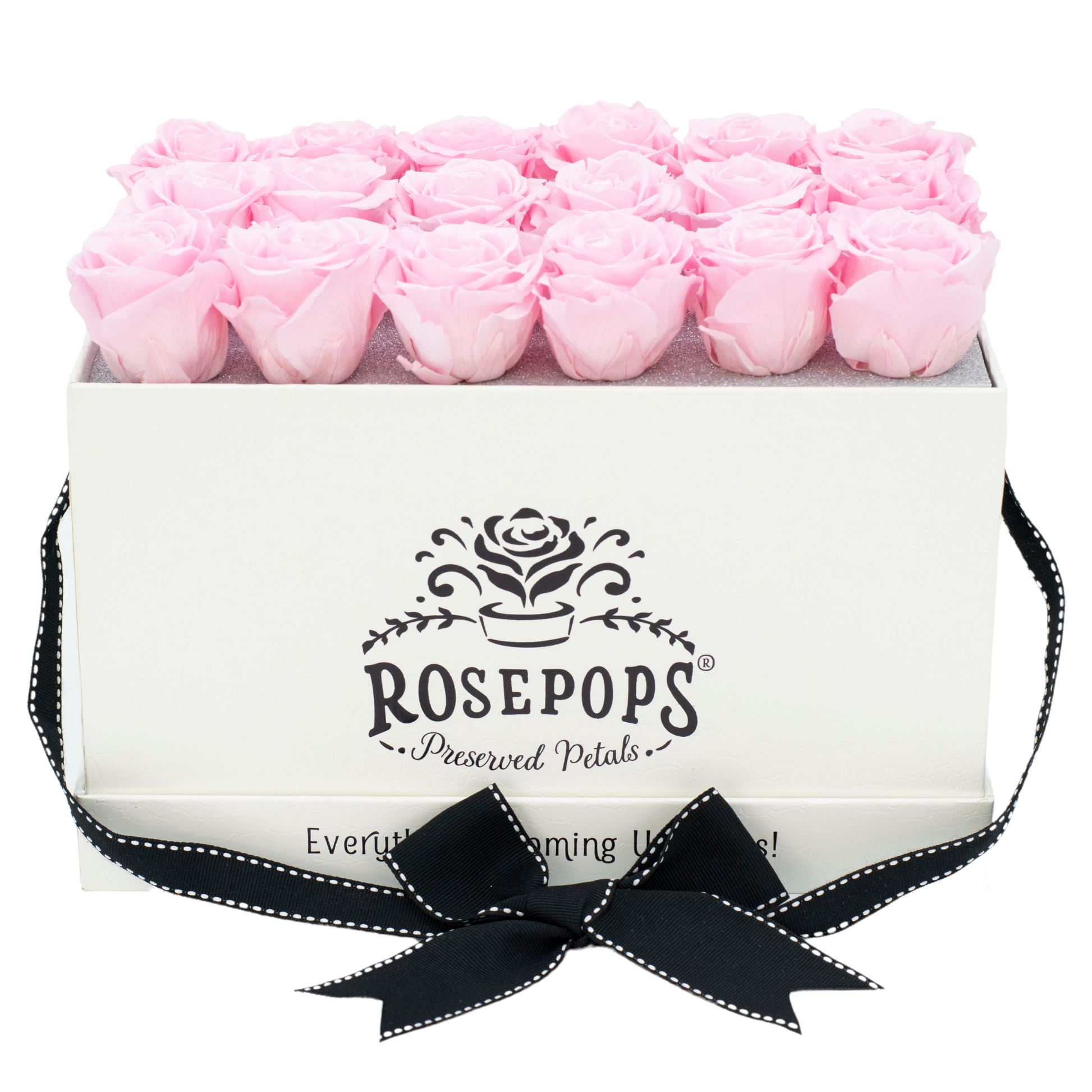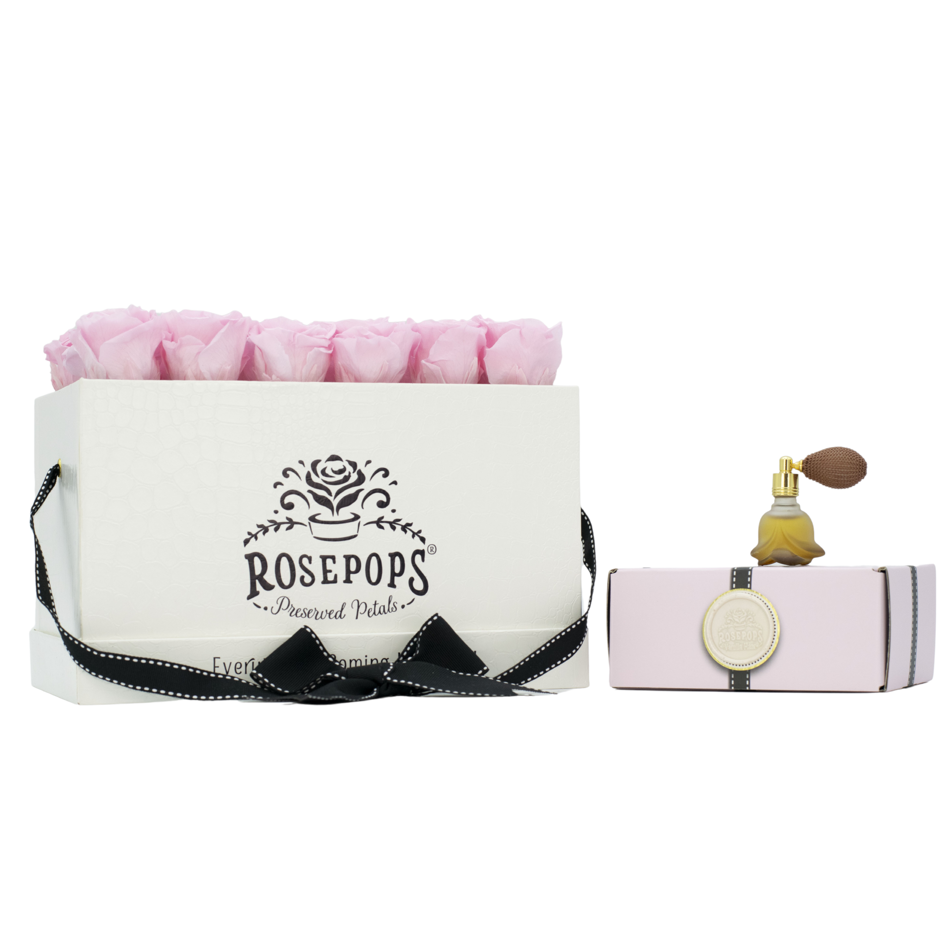 Eighteen captivating Cotton Candy blooms artfully arranged in White mock crocodile are the perfect pairing for an over the POP gifting experience! Boasting our custom blended Vanilla Haze Arosatherapy fragrance, these preserved petals will delight all of the senses with Myrrh and Rum top notes enriched by bold and smoky Vanilla base notes and a Suede and Mahogany finish.