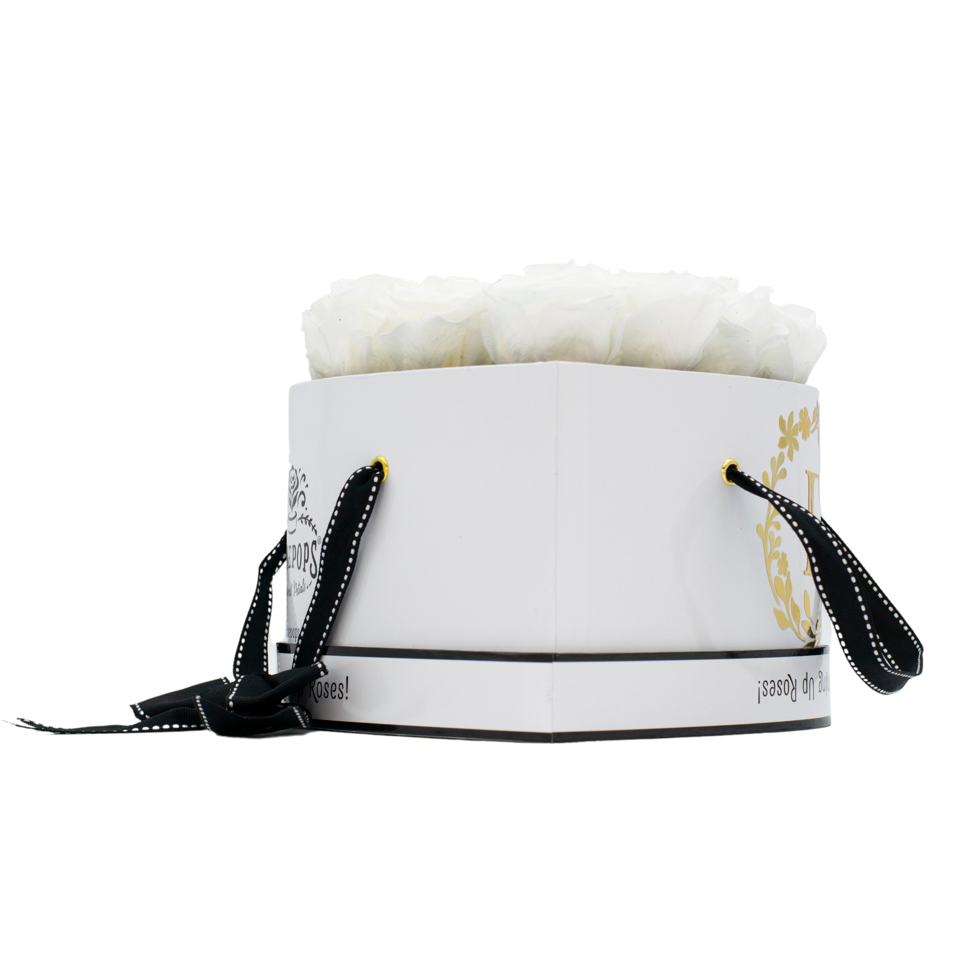 A heart overflowing with sweetness and 13 magnificent Marshmallow blooms will leave an impression that lasts as long as our roses! Personalize this glossy White box with your loved one's initial inside a gleaming gold garland for maximum elegance and delight!
