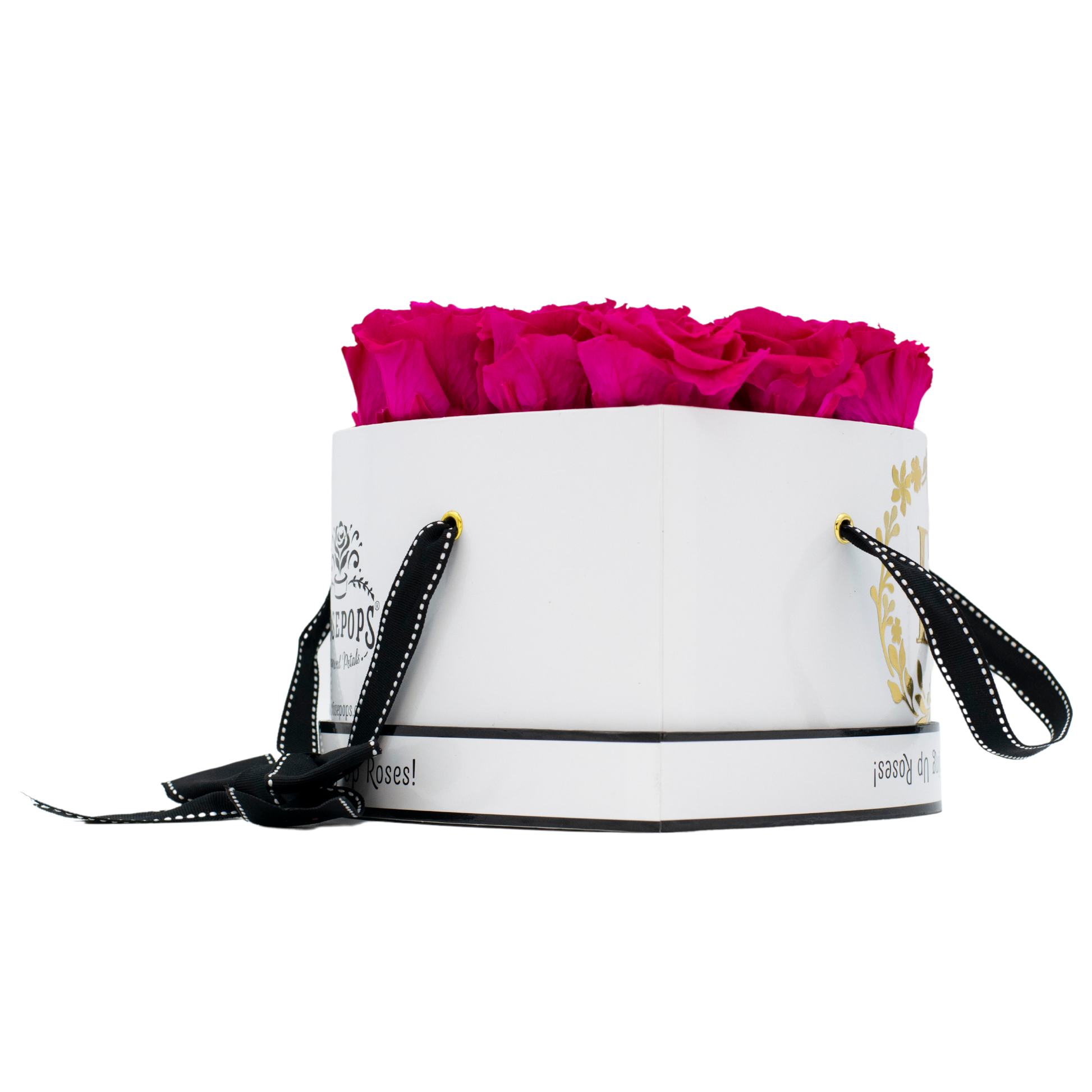 A heart overflowing with sweetness and 13 ravishing Raspberry blooms will leave an impression that lasts as long as our roses! Personalize this glossy White box with your loved one's initial inside a gleaming gold garland for maximum elegance and delight!