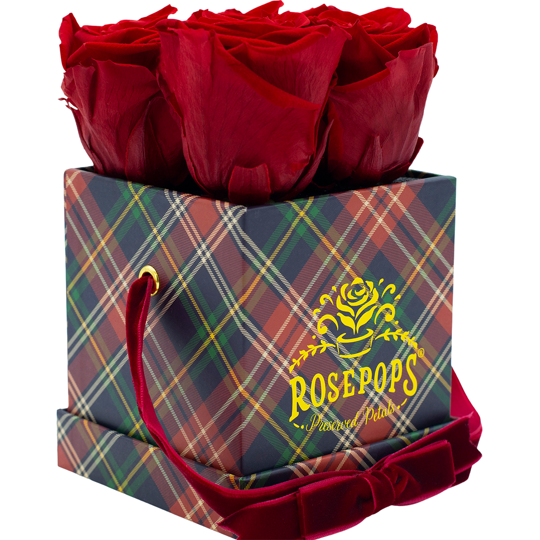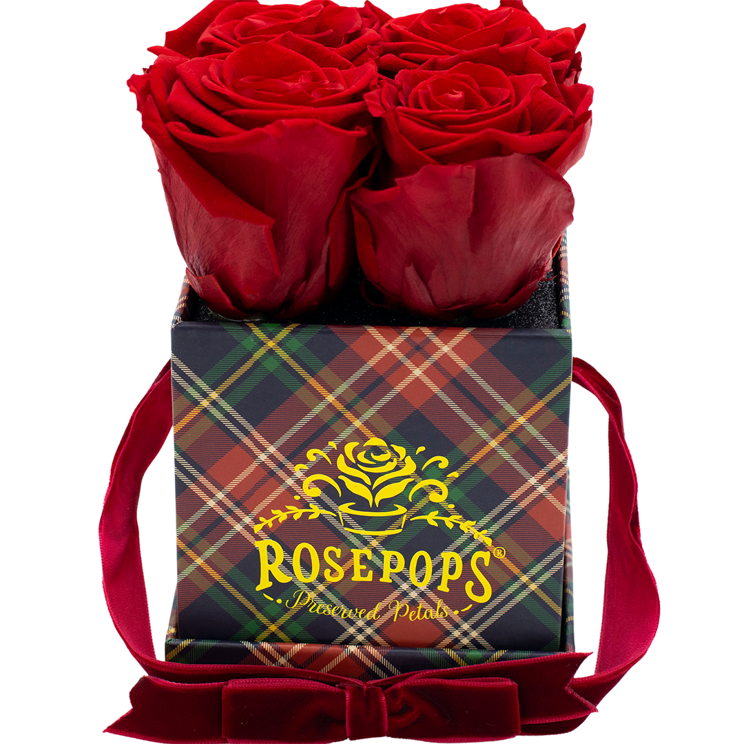Four captivating red roses are sure to delight nestled in rich red plaid which will enhance any decor! These preserved petals have been scented with our custom blended Red Carpet Rose Arosatherapy fragrance, which embodies a perfect synthesis of Mediterranean rose petals warmed by Patchouli and Tonka Bean base notes.